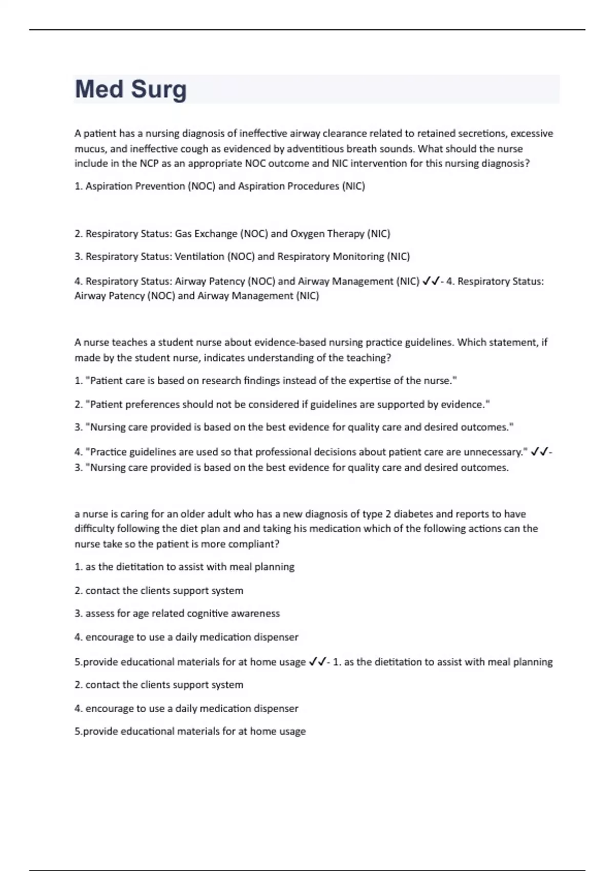 A patient has a nursing diagnosis of ineffective airway clearance related to retained secretions, excessive mucus, and ineffective cough as evidenced by adventitious breath sounds. What should the nurse include in the NCP as an appropriate NOC outcome and NIC intervention for this nursing diagnosis? 1. Aspiration Prevention (NOC) and Aspiration Procedures (NIC) 2. Respiratory Status: Gas Exchange (NOC) and Oxygen Therapy (NIC) 3. Respiratory Status: Ventilation (NOC) and Respiratory Monitoring (NIC) 4. Respiratory Status: Airway Patency (NOC) and Airway Management (NIC) - 4. Respiratory Status: Airway Patency (NOC) and Airway Management (NIC) A nurse teaches a student nurse about evidence-based nursing practice guidelines. Which statement, if made by the student nurse, indicates understanding of the teaching? 1. "Patient care is based on research findings instead of the expertise of the nurse." 2. "Patient preferences should not be considered if guidelines are supported by evidence." 3. "Nursing care provided is based on the best evidence for quality care and desired outcomes." 4. "Practice guidelines are used so that professional decisions about patient care are unnecessary." - 3. "Nursing care provided is based on the best evidence for quality care and desired outcomes. a nurse is caring for an older adult who has a new diagnosis of type 2 diabetes and reports to have difficulty following the diet plan and and taking his medication which of the following actions can the nurse take so the patient is more compliant? 1. as the dietitation to assist with meal planning 2. contact the clients support system 3. assess for age related cognitive awareness 4. encourage to use a daily medication dispenser de educational materials for at home usage - 1. as the dietitation to assist with meal planning 2. contact the clients support system 4. encourage to use a daily medication dispenser de educational materials for at home usage
