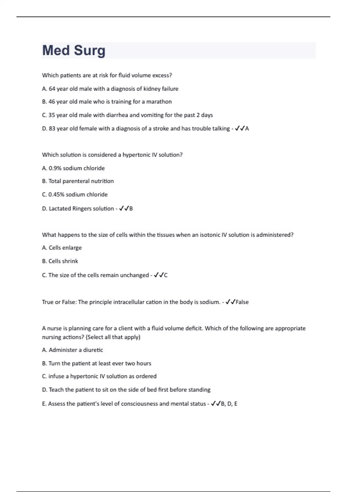 Which patients are at risk for fluid volume excess? A. 64 year old male with a diagnosis of kidney failure B. 46 year old male who is training for a marathon C. 35 year old male with diarrhea and vomiting for the past 2 days D. 83 year old female with a diagnosis of a stroke and has trouble talking - A Which solution is considered a hypertonic IV solution? A. 0.9% sodium chloride B. Total parenteral nutrition C. 0.45% sodium chloride D. Lactated Ringers solution - B What happens to the size of cells within the tissues when an isotonic IV solution is administered? A. Cells enlarge B. Cells shrink C. The size of the cells remain unchanged - C True or False: The principle intracellular cation in the body is sodium. - False A nurse is planning care for a client with a fluid volume deficit. Which of the following are appropriate nursing actions? (Select all that apply) A. Administer a diuretic B. Turn the patient at least ever two hours C. infuse a hypertonic IV solution as ordered D. Teach the patient to sit on the side of bed first before standing E. Assess the patient's level of consciousness and mental status - B, D, E