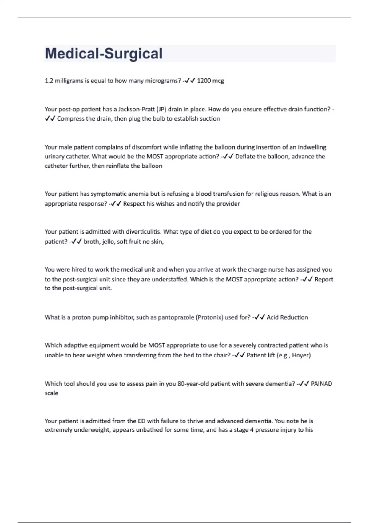 1.2 milligrams is equal to how many micrograms? - 1200 mcg Your post-op patient has a Jackson-Pratt (JP) drain in place. How do you ensure effective drain function? - Compress the drain, then plug the bulb to establish suction Your male patient complains of discomfort while inflating the balloon during insertion of an indwelling urinary catheter. What would be the MOST appropriate action? - Deflate the balloon, advance the catheter further, then reinflate the balloon Your patient has symptomatic anemia but is refusing a blood transfusion for religious reason. What is an appropriate response? - Respect his wishes and notify the provider Your patient is admitted with diverticulitis. What type of diet do you expect to be ordered for the patient? - broth, jello, soft fruit no skin, You were hired to work the medical unit and when you arrive at work the charge nurse has assigned you to the post-surgical unit since they are understaffed. Which is the MOST appropriate action? - Report to the post-surgical unit. What is a proton pump inhibitor, such as pantoprazole (Protonix) used for? - Acid Reduction Which adaptive equipment would be MOST appropriate to use for a severely contracted patient who is unable to bear weight when transferring from the bed to the chair? - Patient lift (e.g., Hoyer) Which tool should you use to assess pain in you 80-year-old patient with severe dementia? - PAINAD scale Your patient is admitted from the ED with failure to thrive and advanced dementia. You note he is extremely underweight, appears unbathed for some time, and has a stage 4 pressure injury to his
