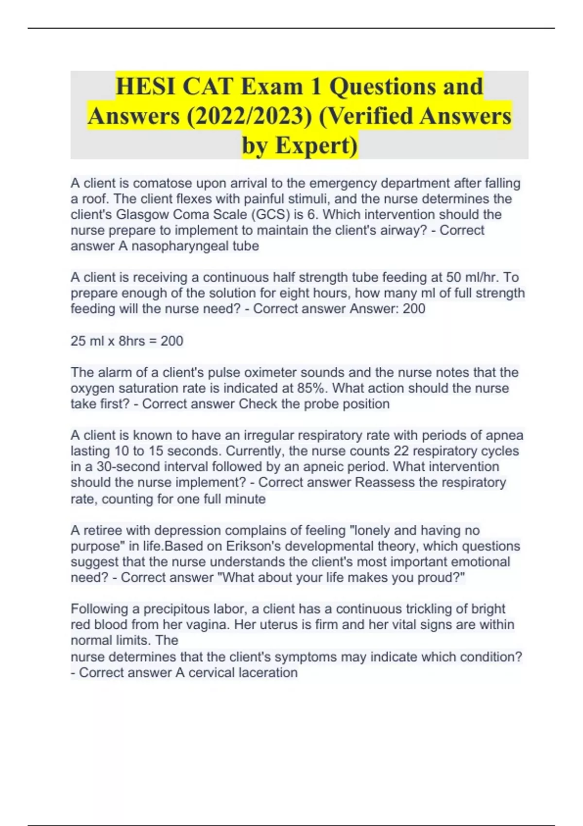 HESI CAT Exam 1 Questions and Answers (2022/2023) (Verified Answers by Expert)