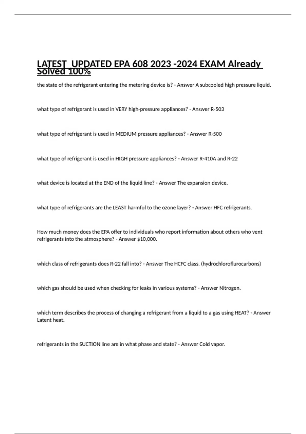 the state of the refrigerant entering the metering device is? - Answer A subcooled high pressure liquid. what type of refrigerant is used in VERY high-pressure appliances? - Answer R-503 what type of refrigerant is used in MEDIUM pressure appliances? - Answer R-500 what type of refrigerant is used in HIGH pressure appliances? - Answer R-410A and R-22 what device is located at the END of the liquid line? - Answer The expansion device. what type of refrigerants are the LEAST harmful to the ozone layer? - Answer HFC refrigerants. How much money does the EPA offer to individuals who report information about others who vent refrigerants into the atmosphere? - Answer $10,000. which class of refrigerants does R-22 fall into? - Answer The HCFC class. (hydrochloroflurocarbons) which gas should be used when checking for leaks in various systems? - Answer Nitrogen. which term describes the process of changing a refrigerant from a liquid to a gas using HEAT? - Answer Latent heat. refrigerants in the SUCTION line are in what phase and state? - Answer Cold vapor. how many miles above the Earth's surface does the ozone layer in the stratosphere extend? - Answer 31 miles. what year was the Montreal Protocol put in place? - Answer 1989. refrigerant recovery equipment should be checked for (blank) on a daily basis? - Answer Refrigerant leaks and oil levels. should recovery machines be used on equipment that contains hydrogen? - Answer NO. which purity test is used to determine the type of refrigerant? - Answer ARI 700. what type of unit only requires ONE service connection? - Answer self-contained recovery units. air will cause (blank) discharge pressures in a refrigeration system. - Answer Higher. a strong odor is around during the recovery process. what is most likely the cause of this? - Answer A compressor burnout. what is the best way (position) to transport refrigeration cylinders? - Answer Upright. you can only accurately read refrigerant pressure with a stable (blank)? - Answer Temperature. an explosion can occur if (blank) is vented in an enclosed environment? - Answer Hydrogen. can refrigerants be mixed in a recovery tank? - Answer NO. what is the state of refrigerant leaving the liquid receiver? - Answer High pressure liquid. what is the minimum microns a vacuum pump must pull when evacuating a system? - Answer 500 microns. what is usually contained in refrigerants made before 1950? - Answer SO2. (sulfur dioxide) what prevents transient slugs of liquid from getting into the compressor? - Answer Accumulator. what is the filter drier responsible for removing? - Answer Moisture and Particulates. can the compressor compress liquid? - Answer NO. what is the best leak-checking procedure for a pressure decay test? - Answer Nitrogen. when the annual leak rate exceeds (blank), all comfort cooling systems with more than 50lb of refrigerant must be repaired. - Answer 15% True or False. the receiver is not part of the low side of a system located in a refrigeration system? - Answer True. how often should leaks be checked in the recovery or recycling unit for commercial refrigeration equipment? - Answer 3 months. how can you check if there is excess air / non-condensables in the tank? - Answer Checking the pressure inside the recovery tank. Reference the pressure / temperature chart. what type of system can a vacuum pump be used on for recovery? - Answer System-dependent (passive) recovery. when using a system-dependent recovery system with an operating compressor, where should the refrigerant be recovered from? - Answer High side of the system. when using a system-dependent recovery system with a non-operating compressor, where should the refrigerant be recovered from? - Answer Both high and low side. how can you release trapped refrigerants in the oil during recovery? - Answer Heat and tap the compressor with a mallet. when should piercing type valves be used and what is a common problem of these valves? - Answer Fitting tend to leak over time and should not be left on appliances. when was it established that it was a violation to vent CFCs or HCFCs? - Answer July 1st, 1992. when was it required for recovery/recycling equipment to be certified and labeled by the EPA? - Answer November 15th, 1993.