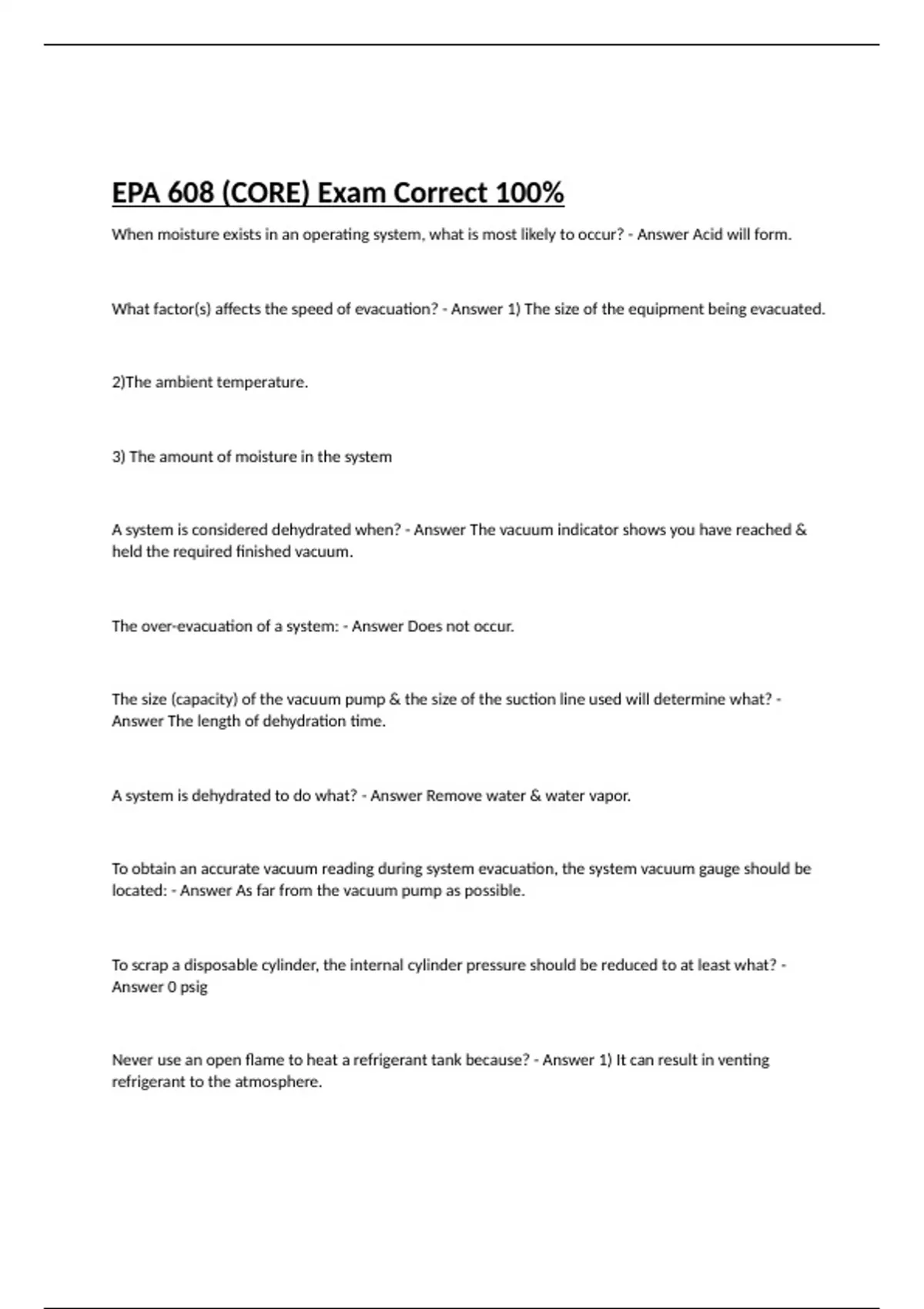 When moisture exists in an operating system, what is most likely to occur? - Answer Acid will form. What factor(s) affects the speed of evacuation? - Answer 1) The size of the equipment being evacuated. 2)The ambient temperature. 3) The amount of moisture in the system A system is considered dehydrated when? - Answer The vacuum indicator shows you have reached & held the required finished vacuum. The over-evacuation of a system: - Answer Does not occur. The size (capacity) of the vacuum pump & the size of the suction line used will determine what? - Answer The length of dehydration time. A system is dehydrated to do what? - Answer Remove water & water vapor. To obtain an accurate vacuum reading during system evacuation, the system vacuum gauge should be located: - Answer As far from the vacuum pump as possible. To scrap a disposable cylinder, the internal cylinder pressure should be reduced to at least what? - Answer 0 psig