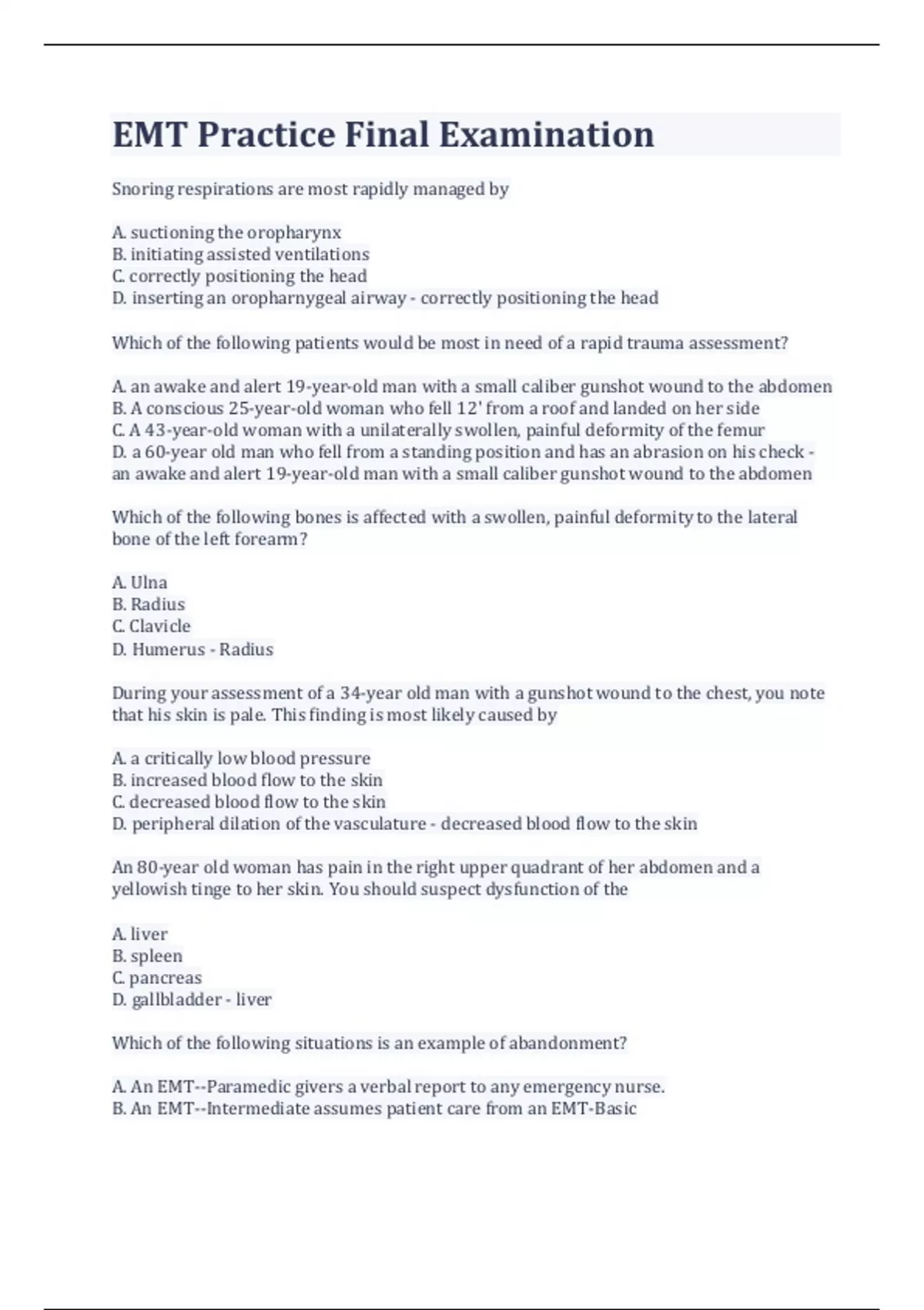 EMT Practice Final Examination Snoring respirations are most rapidly managed by A. suctioning the oropharynx B. initiating assisted ventilations C. correctly positioning the head D. inserting an oropharnygeal airway - correctly positioning the head Which of the following patients would be most in need of a rapid trauma assessment? A. an awake and alert 19-year-old man with a small caliber gunshot wound to the abdomen B. A conscious 25-year-old woman who fell 12' from a roof and landed on her side C. A 43-year-old woman with a unilaterally swollen, painful deformity of the femur D. a 60-year old man who fell from a standing position and has an abrasion on his check - an awake and alert 19-year-old man with a small caliber gunshot wound to the abdomen Which of the following bones is affected with a swollen, painful deformity to the lateral bone of the left forearm? A. Ulna B. Radius C. Clavicle D. Humerus - Radius During your assessment of a 34-year old man with a gunshot wound to the chest, you note that his skin is pale. This finding is most likely caused by A. a critically low blood pressure B. increased blood flow to the skin C. decreased blood flow to the skin D. peripheral dilation of the vasculature - decreased blood flow to the skin An 80-year old woman has pain in the right upper quadrant of her abdomen and a yellowish tinge to her skin. You should suspect dysfunction of the A. liver B. spleen C. pancreas D. gallbladder - liver Which of the following situations is an example of abandonment? A. An EMT--Paramedic givers a verbal report to any emergency nurse. B. An EMT--Intermediate assumes patient care from an EMT-Basic C. An EMT--Basic transfers care of a patient to patient to an EMT-Paramedic D. A first responder assumes patient care from an EMT-Intermediate - A first responder assumes patient care from an EMT-Intermediate Which artery should you palpate when assessing for a pulse in an unresponsive 6-month old patient? A. Radial B. Carotid C. Femoral D. Brachial - Brachial During the initial assessment of a trauma patient, you note massive facial injuries, weak radial pulses, and clammy skin. What should be your most immediate concern? A. Potential obstruction of the airway B. Internal bleeding and severe shock C. Applying 100% supplemental oxygen D. Providing rapid transport to a trauma center - Potential obstruction of the airway You are called to treat a male patient who overdosed on heroin and and is unconscious with shallow breathing and cyanosis to the face. The patient suddenly begins to vomit. What should you do first? A. Suction the oropharynx B. Turn the patient onto his side. C. Insert an oropharyngeal airway. D. Assist ventilations with 100% oxygen. - Turn the patient onto his side. The scene size up includes all of the following components, EXCEPT A. determining scene safety B. applying personal protective gear C. assessing the need for assistance D. evaluating the mechanism of injury - applying personal protective gear In which of the following patients would an oropharyngeal airway be indicated? A. Any patient suspected of having hypoxia B. A semiconscious patient with an intact gag reflex C. A semiconscious patient who took an overdose of propoxyphene D. An unconscious patient with fluid drainage from the ears - An unconscious patient with fluid drainage from the ears Upon arriving at the scene of a multiple vehicle crash, you can see that at least two patients have been ejected from their vehicles. What should you do next? A. Begin triage B. Treat the most critical patient first C. Gather all of the patients together D. Call for at least one more ambulance - Call for at least one more ambulance A 75 year old man has generalized weakness and chest pain. He has a bottle of prescribed nitroglycerin and he states that he has not taken any of his medication. After initiating oxygen therapy, you should next A. apply the AED and prepare the patient for immediate transport B. perform a detailed physical examination to located any other problems. C. contact medical control for permission to assist the patient with his nitroglycerin. D. complete a focused physical examination, including obtaining baseline vital signs. - complete a focused physical examination, including obtaining baseline vital signs. Which of the following organs is not part of the endocrine system? A. Thyroid B. Pituitary C. Pancreas D. Gallbladder - Gallbladder Which of the following injuries or conditions should be managed first? A. Fluid drainage from both ears B. Bleeding within the oral cavity C. A large open abdominal wound D. Bilateral fractures of the femurs - Bleeding within the oral cavity You arrive at a residence where you find a man lying unconscious in his front yard. There were no witnesses to the event that caused the unconsciousness. In assessing this man, you must assume that he A. has sustained an injury B. is having a heart attack C. is having a diabetic reaction D. is having a heat-related emergency - has sustained an injury When is the best time to perform a detailed physical examination? A. While enroute to the hospital B. After all life threats have been ruled out C. Immediately after taking baseline vital signs D. Following the initial assessment of a trauma patient. - While enroute to the hospital Which of the following conditions would most likely cause flushed skin? A. Shock B. Hypoxia C. Exposure to heat D. Low blood pressure - Exposure to heat During the rapid trauma assessment of a patient with multiple injuries, you expose the chest and find an open wound with blood bubbling from it. What should you do next? A. Apply 100% supplemental oxygen. B. Provide rapid transport to the hospital C. Prevent air from entering the wound. D. Place a porous dressing over the wound. - Prevent air from entering the wound. You are called to a local park for a 7-year old boy with respiratory distress. During your assessment, you find that the patient is wheezing and has wide-spread hives and