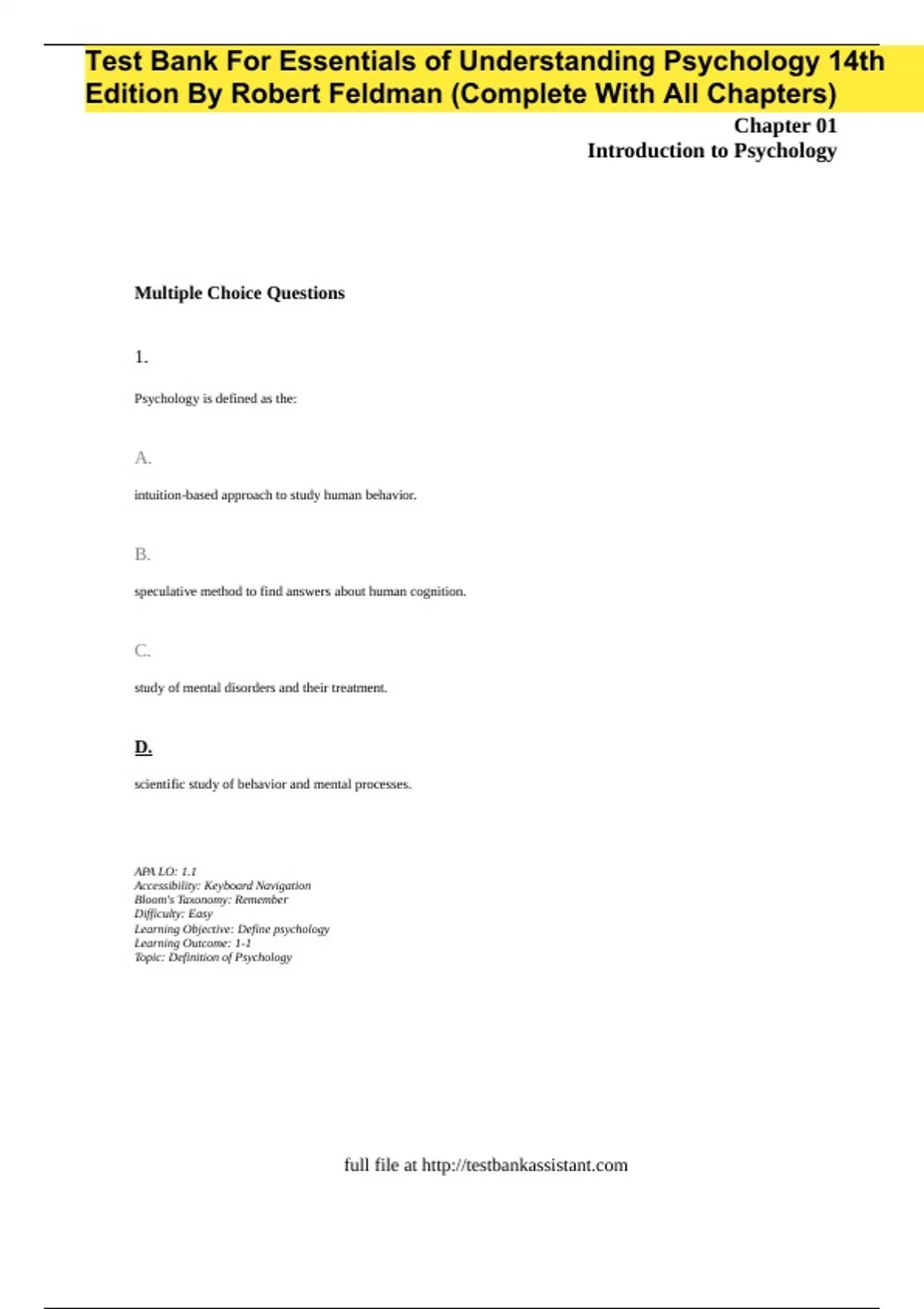 Test Bank For Essentials of Understanding Psychology 14th Edition By Robert Feldman (Complete With All Chapters)