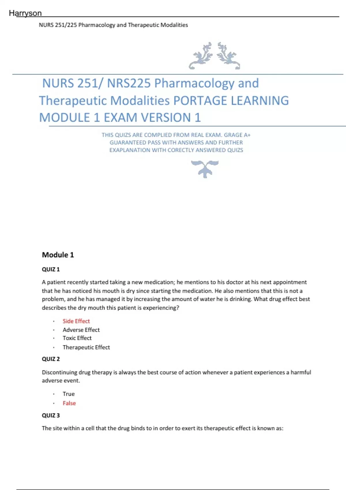 Nurs 251 nrs225 pharmacology and therapeutic modalities portage learning module 1 exam version 1RS 251/225 Pharmacology and Therapeutic Modalities NURS 251/ NRS225 Pharmacology and Therapeutic Modalities PORTAGE LEARNING MODULE 1 EXAM VERSION 1 THIS QUIZS ARE COMPLIED FROM REAL EXAM. GRAGE A+ GUARANTEED PASS WITH ANSWERS AND FURTHER EXAPLANATION WITH CORECTLY ANSWERED QUIZS Module 1 QUIZ 1 A patient recently started taking a new medication; he mentions to his doctor at his next appointment that he has noticed his mouth is dry since starting the medication. He also mentions that this is not a problem, and he has managed it by increasing the amount of water he is drinking. What drug effect best describes the dry mouth this patient is experiencing? • Side Effect • Adverse Effect • Toxic Effect • Therapeutic Effect QUIZ 2 Discontinuing drug therapy is always the best course of action whenever a patient experiences a harmful adverse event. • True • False QUIZ 3 The site within a cell that the drug binds to in order to exert its therapeutic effect is known as: Harryson NURS 251/225 Pharmacology and Therapeutic Modalities • Binding site • Receptor • Cell wall • Agonist QUIZ 4 When a drug bindsto a cell exerting its effect leading to a decrease in that cell’s physiologic response that drug is acting as an agonist. • True • False False. An agonist would cause in increase in that cell’s physiologic response. When the drug decreases a cell’s physiologic response it is called an antagonist. QUIZ 5 Match the following termsto the best definition 1. Duration of Action A. Drug concentration is above MEC and below MTC 2. Onset of Action B. Time from administration to first effect 3. Therapeutic Range C. Length of time the drug produces its effect 1. Duration of Action C