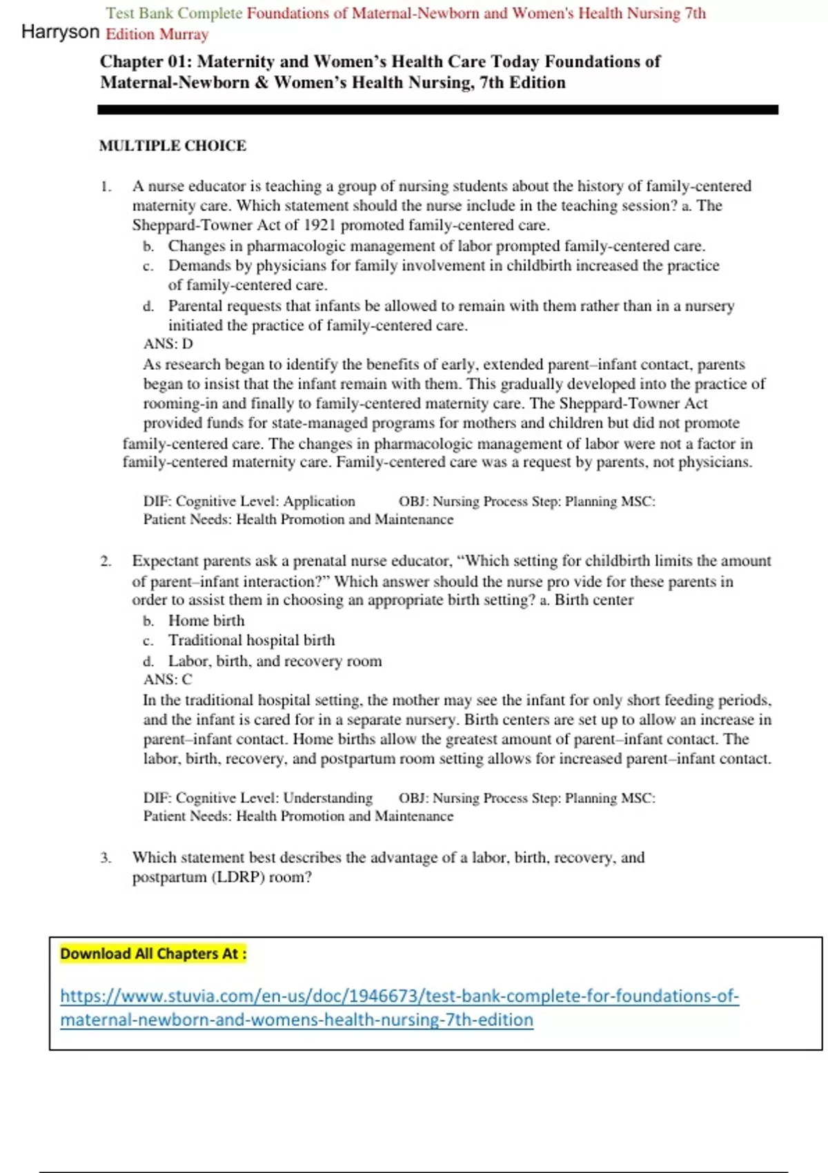 Test bank for foundations of maternal newborn nursing women s health nursing by murray all chaptersst Bank Complete Foundations of Maternal-Newborn and Women's Health Nursing 7th Edition Murray Chapter 01: Maternity and Women’s Health Care Today Foundations of Maternal-Newborn & Women’s Health Nursing, 7th Edition MULTIPLE CHOICE 1. A nurse educator is teaching a group of nursing students about the history of family-centered maternity care. Which statement should the nurse include in the teaching session? a. The Sheppard-Towner Act of 1921 promoted family-centered care. b. Changes in pharmacologic management of labor prompted family-centered care. c. Demands by physicians for family involvement in childbirth increased the practice of family-centered care. d. Parental requests that infants be allowed to remain with them rather than in a nursery initiated the practice of family-centered care. ANS: D As research began to identify the benefits of early, extended parent–infant contact, parents began to insist that the infant remain with them. This gradually developed into the practice of rooming-in and finally to family-centered maternity care. The Sheppard-Towner Act provided funds for state-managed programs for mothers and children but did not promote family-centered care. The changes in pharmacologic management of labor were not a factor in family-centered maternity care. Family-centered care was a request by parents, not physicians. DIF: Cognitive Level: Application OBJ: Nursing Process Step: Planning MSC: Patient Needs: Health Promotion and Maintenance 2. Expectant parents ask a prenatal nurse educator, “Which setting for childbirth limits the amount of parent–infant interaction?” Which answer should the nurse pro vide for these parents in order to assist them in choosing an appropriate birth setting? a. Birth center b. Home birth c. Traditional hospital birth d. Labor, birth, and recovery room ANS: C In the traditional hospital setting, the mother may see the infant for only short feeding periods, and the infant is cared for in a separate nursery. Birth centers are set up to allow an increase in parent–infant contact. Home births allow the greatest amount of parent–infant contact. The labor, birth, recovery, and postpartum room setting allows for increased parent–infant contact. DIF: Cognitive Level: Understanding OBJ: Nursing Process Step: Planning MSC: Patient Needs: Health Promotion and Maintenance 3. Which statement best describes the advantage of a labor, birth, recovery, and postpartum (LDRP) room? Download All Chapters At : H