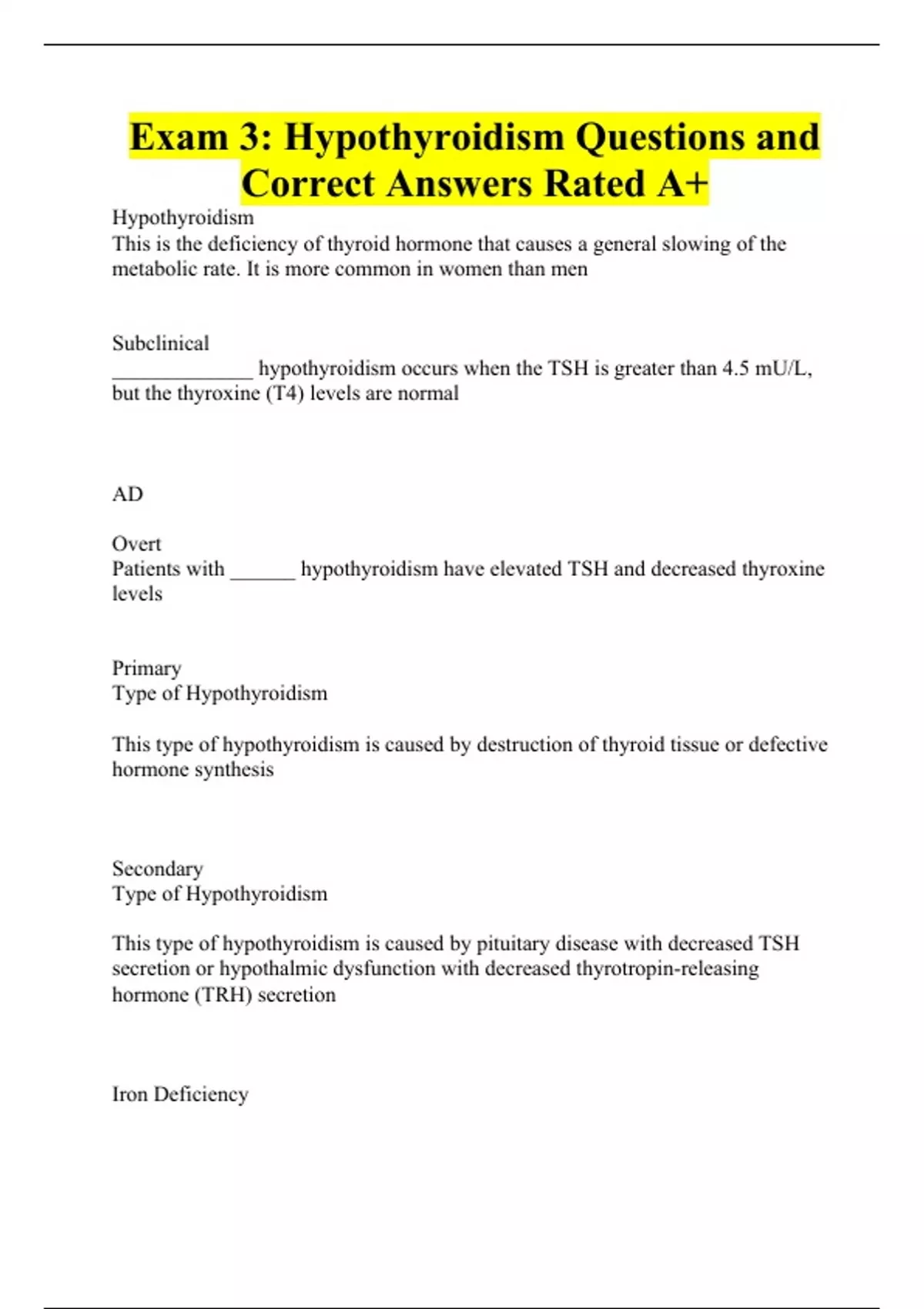 Exam 3: Hypothyroidism Questions and Correct Answers Rated A+