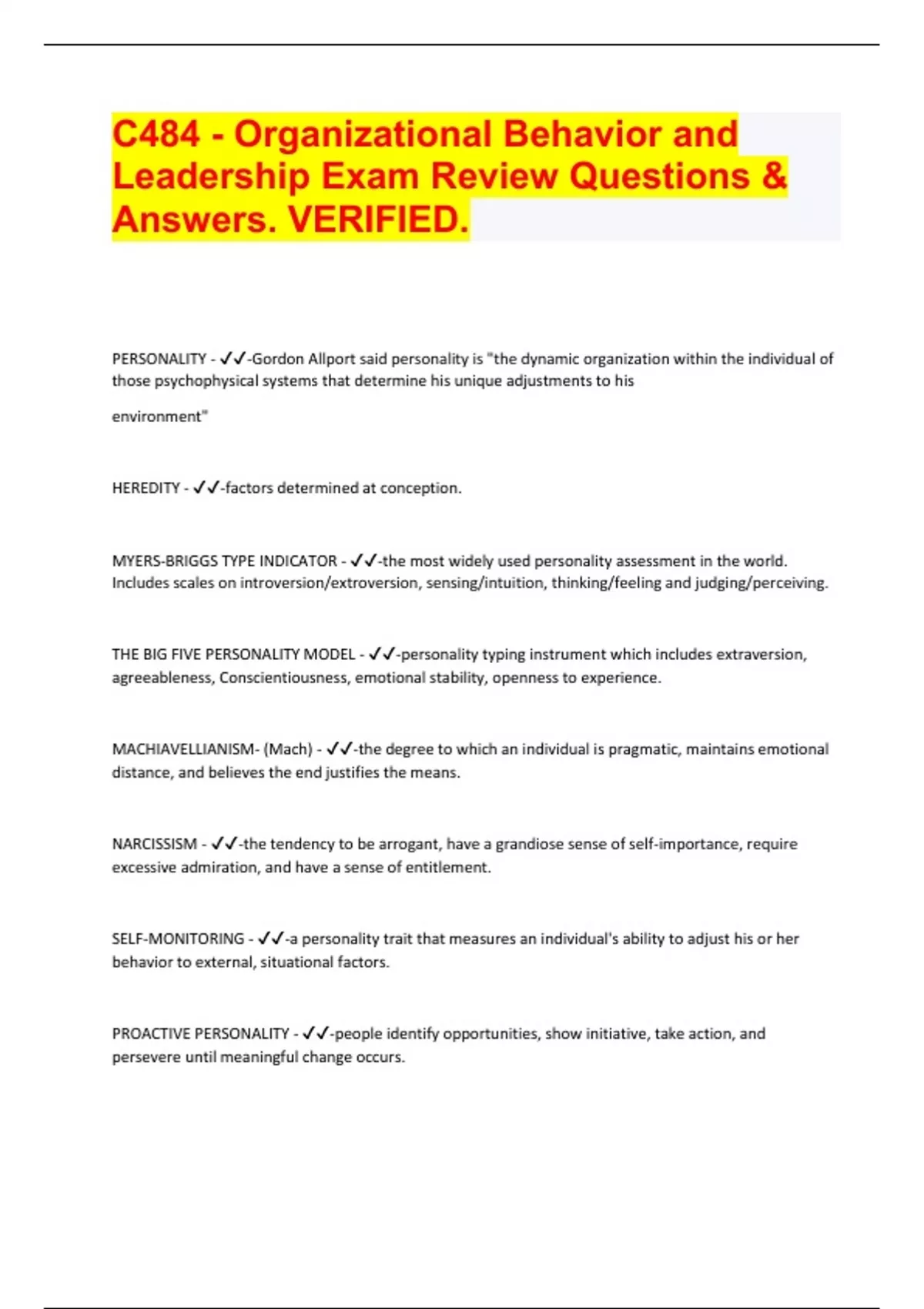 C484 - Organizational Behavior and Leadership Exam Review Questions & Answers. VERIFIED. PERSONALITY - -Gordon Allport said personality is "the dynamic organization within the individual of those psychophysical systems that determine his unique adjustments to his environment" HEREDITY - -factors determined at conception. MYERS-BRIGGS TYPE INDICATOR - -the most widely used personality assessment in the world. Includes scales on introversion/extroversion, sensing/intuition, thinking/feeling and judging/perceiving. THE BIG FIVE PERSONALITY MODEL - -personality typing instrument which includes extraversion, agreeableness, Conscientiousness, emotional stability, openness to experience. MACHIAVELLIANISM- (Mach) - -the degree to which an individual is pragmatic, maintains emotional distance, and believes the end justifies the means. NARCISSISM - -the tendency to be arrogant, have a grandiose sense of self-importance, require excessive admiration, and have a sense of entitlement. SELF-MONITORING - -a personality trait that measures an individual's ability to adjust his or her behavior to external, situational factors. PROACTIVE PERSONALITY - -people identify opportunities, show initiative, take action, and persevere until meaningful change occurs. VALUES - -basic convictions that a specific mode of conduct or end-state of existence is personally or socially preferable to an opposite or converse mode of conduct or end-state of existence. TERMINAL VALUES - -desirable end-states of existence; the goals a person would like to achieve during his or her lifetime. INSTRUMENTAL VALUES - -preferable modes of behavior or means of achieving one's terminal values. POWER DISTANCE - -a national culture attribute that describes the extent to which a society accepts that power in institutions and organizations is distributed unequally. PERCEPTION - -a process