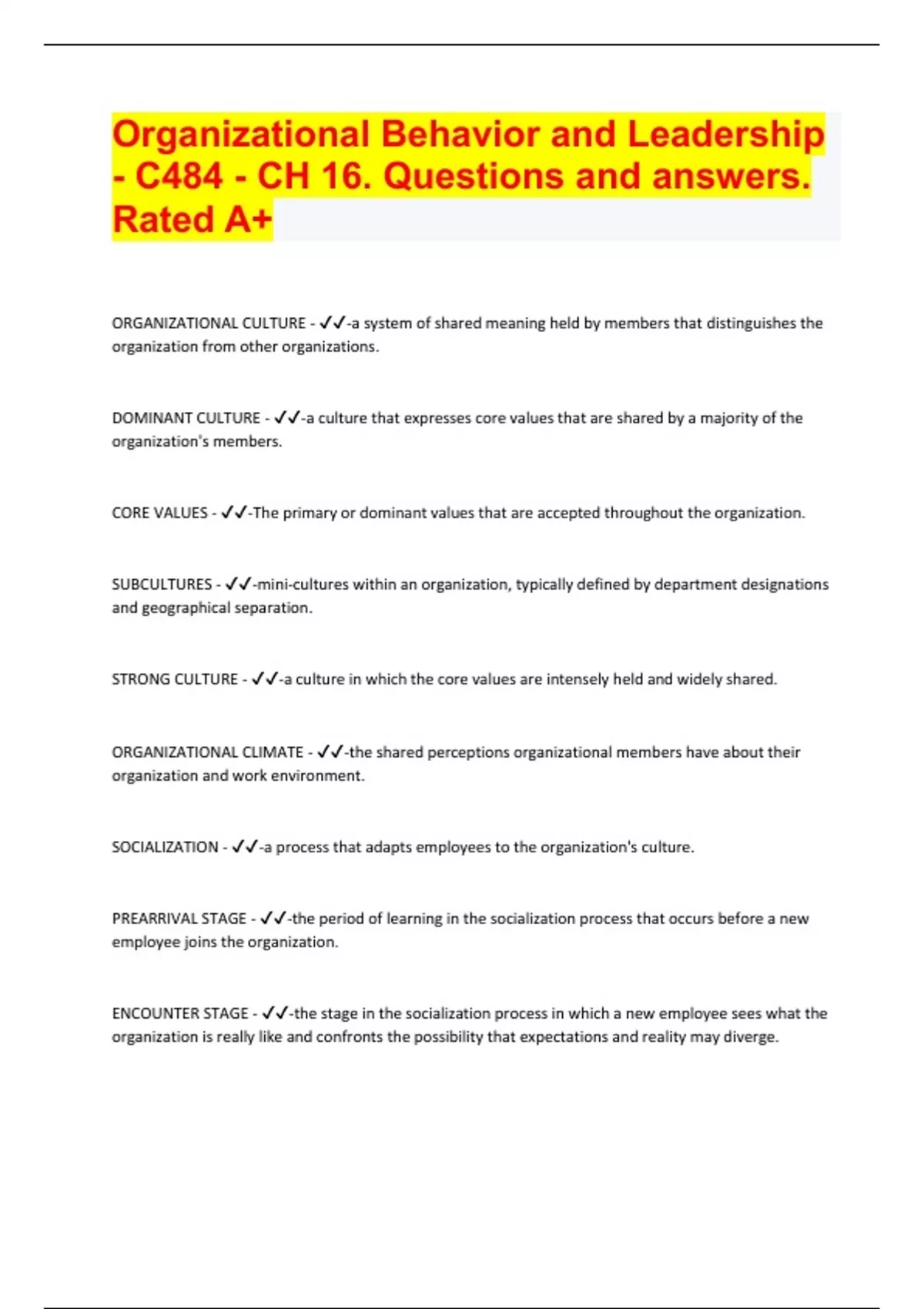 Organizational Behavior and Leadership - C484 - CH 16. Questions and answers. Rated A+ ORGANIZATIONAL CULTURE - -a system of shared meaning held by members that distinguishes the organization from other organizations. DOMINANT CULTURE - -a culture that expresses core values that are shared by a majority of the organization's members. CORE VALUES - -The primary or dominant values that are accepted throughout the organization. SUBCULTURES - -mini-cultures within an organization, typically defined by department designations and geographical separation. STRONG CULTURE - -a culture in which the core values are intensely held and widely shared. ORGANIZATIONAL CLIMATE - -the shared perceptions organizational members have about their organization and work environment. SOCIALIZATION - -a process that adapts employees to the organization's culture. PREARRIVAL STAGE - -the period of learning in the socialization process that occurs before a new employee joins the organization. ENCOUNTER STAGE - -the stage in the socialization process in which a new employee sees what the organization is really like and confronts the possibility that expectations and reality may diverge.