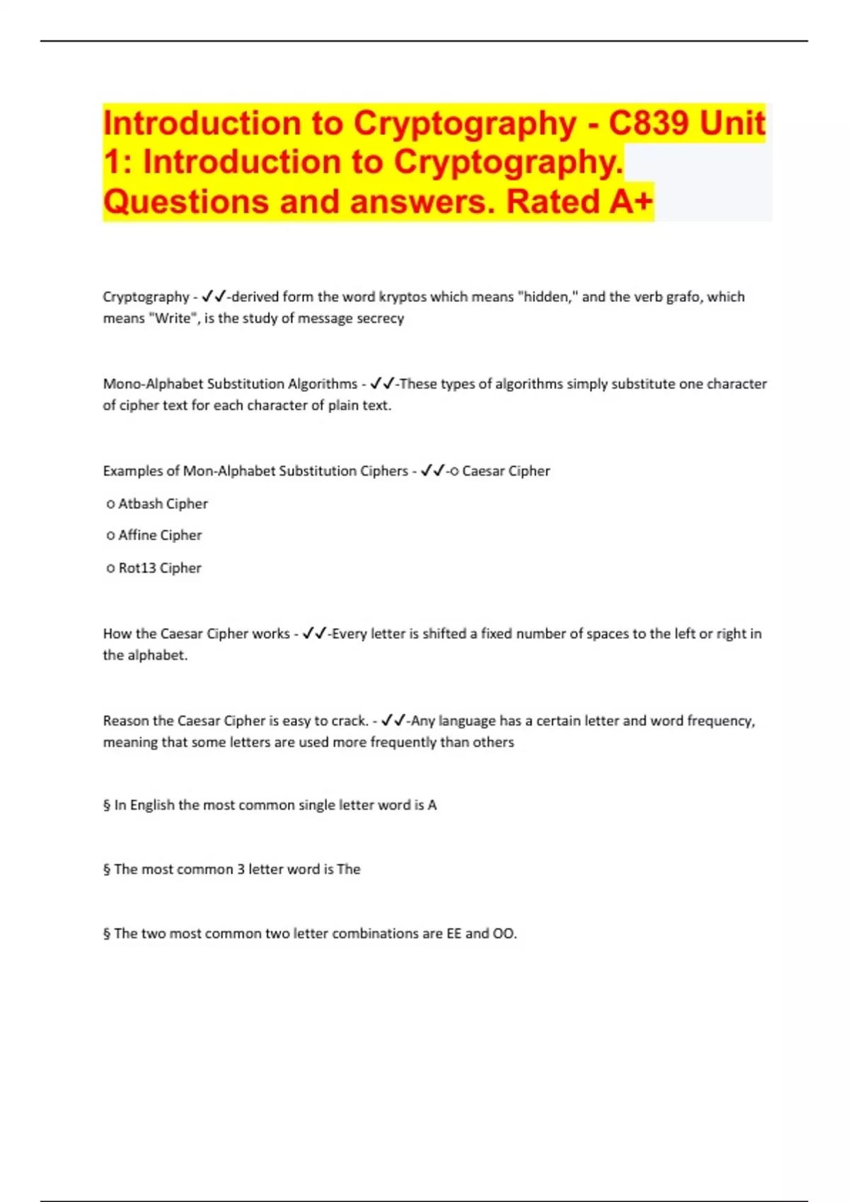 Introduction to Cryptography - C839 Unit 1: Introduction to Cryptography. Questions and answers. Rated A+ Cryptography - -derived form the word kryptos which means "hidden," and the verb grafo, which means "Write", is the study of message secrecy Mono-Alphabet Substitution Algorithms - -These types of algorithms simply substitute one character of cipher text for each character of plain text. Examples of Mon-Alphabet Substitution Ciphers - -○ Caesar Cipher ○ Atbash Cipher ○ Affine Cipher ○ Rot13 Cipher How the Caesar Cipher works - -Every letter is shifted a fixed number of spaces to the left or right in the alphabet. Reason the Caesar Cipher is easy to crack. - -Any language has a certain letter and word frequency, meaning that some letters are used more frequently than others § In English the most common single letter word is A § The most common 3 letter word is The § The two most common two letter combinations are EE and OO. key - -the term used to describe the number that is used by the algorithm to encrypt or decrypt a message. Ciphertext - -the resultant text that is created when encryption is applied to plaintext. Atbash Cipher - -A hebrew code which substitutes the first letter of the alphabet for the last and the second letter for the second to last, etc. - simply reverses the alphabet - A becomes Z, B Becomes y, and so on. What is the basic concept of cryptography? - -To perform some permutation on plain text to render it difficult to read by those who don't have the key to decipher the cipher text Affine Cipher - -any single-substitution alphabet cipher (also called mono-alphabet substitution) in which each letter in the alphabet is mapped to some numeric value, permuted with some relatively simple mathematical function, and then converted back to a letter. What is the basic formula for an affine cipher? - -§ ax + b (mod M) □ M is the size of the alphabet; in English that equals 26 □ The x represents the plain text letter's numeric equivalent, and the b is the shift. □ The a is some multiple; in the case of the Caesar cipher, that is 1 □ So the Caesar cipher, is used by Julius Caesar, would be 1x + 3 (mod 26)