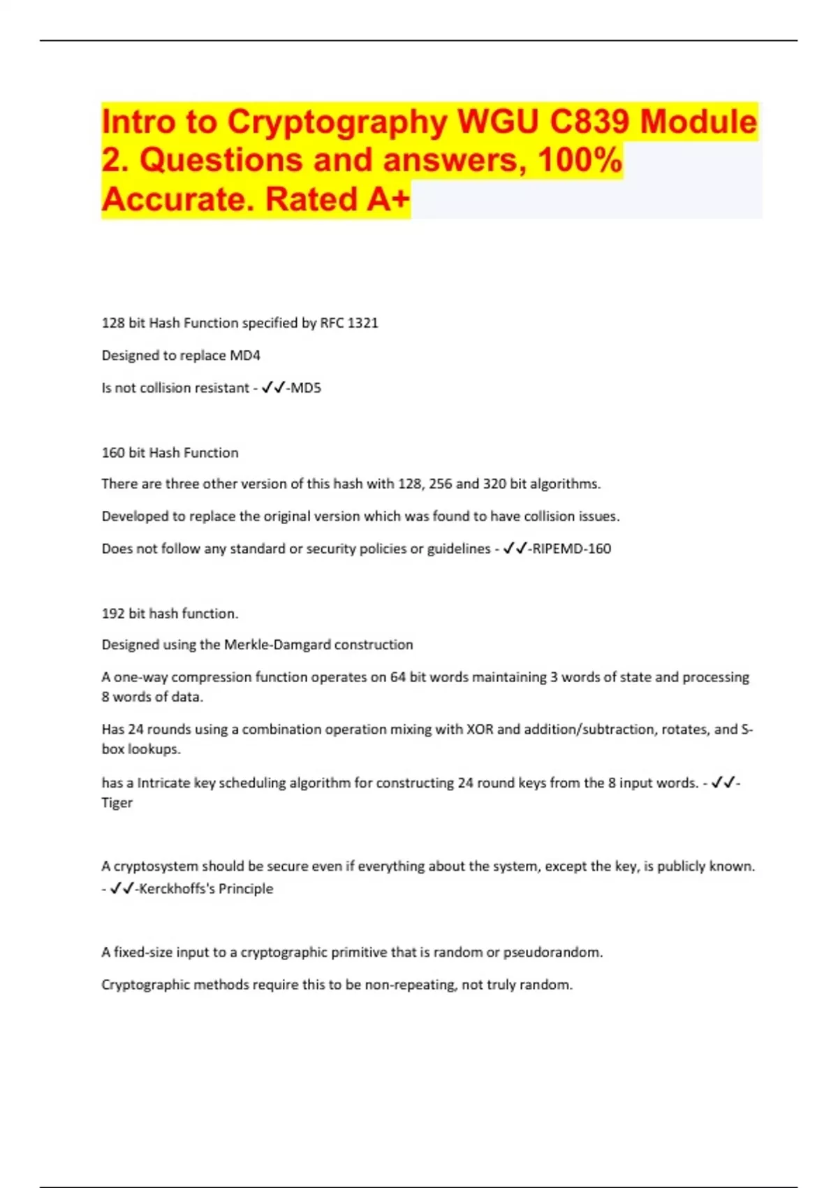 Intro to Cryptography WGU C839 Module 2. Questions and answers, 100% Accurate. Rated A+ 128 bit Hash Function specified by RFC 1321 Designed to replace MD4 Is not collision resistant - -MD5 160 bit Hash Function There are three other version of this hash with 128, 256 and 320 bit algorithms. Developed to replace the original version which was found to have collision issues. Does not follow any standard or security policies or guidelines - -RIPEMD-160 192 bit hash function. Designed using the Merkle-Damgard construction A one-way compression function operates on 64 bit words maintaining 3 words of state and processing 8 words of data. Has 24 rounds using a combination operation mixing with XOR and addition/subtraction, rotates, and S-box lookups. has a Intricate key scheduling algorithm for constructing 24 round keys from the 8 input words. - -Tiger A cryptosystem should be secure even if everything about the system, except the key, is publicly known. - -Kerckhoffs's Principle A fixed-size input to a cryptographic primitive that is random or pseudorandom. Cryptographic methods require this to be non-repeating, not truly random. Is commonly called a nonce (Number Used Once) XORing this with the first block of plaintext or adding it to the front of plaintext prior to encryption solves the Electronic Codebook (ECB) issue when encryption of the same plaintext with the same key results in the same ciphertext. - -Initialization Vector (IV) A random key is XOR'ed with a stream of plaintext. Is sometimes called a state cipher, asynchronous stream cipher or ciphertext autokey (CTAK) - -Symmetric Stream Ciphers A small change yields