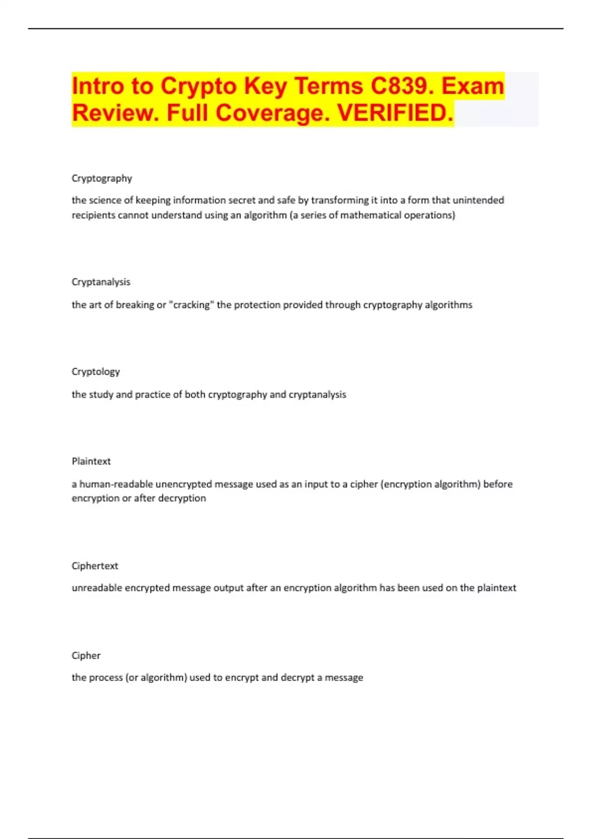 Intro to Crypto Key Terms C839. Exam Review. Full Coverage. VERIFIED.