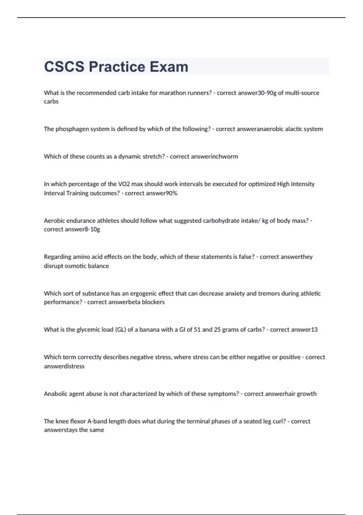 What is the recommended carb intake for marathon runners? - correct answer30-90g of multi-source carbs The phosphagen system is defined by which of the following? - correct answeranaerobic alactic system Which of these counts as a dynamic stretch? - correct answerinchworm In which percentage of the VO2 max should work intervals be executed for optimized High Intensity Interval Training outcomes? - correct answer90% Aerobic endurance athletes should follow what suggested carbohydrate intake/ kg of body mass? - correct answer8-10g Regarding amino acid effects on the body, which of these statements is false? - correct answerthey disrupt osmotic balance Which sort of substance has an ergogenic effect that can decrease anxiety and tremors during athletic performance? - correct answerbeta blockers What is the glycemic load (GL) of a banana with a GI of 51 and 25 grams of carbs? - correct answer13 Which term correctly describes negative stress, where stress can be either negative or positive - correct answerdistress Anabolic agent abuse is not characterized by which of these symptoms? - correct answerhair growth The knee flexor A-band length does what during the terminal phases of a seated leg curl? - correct answerstays the