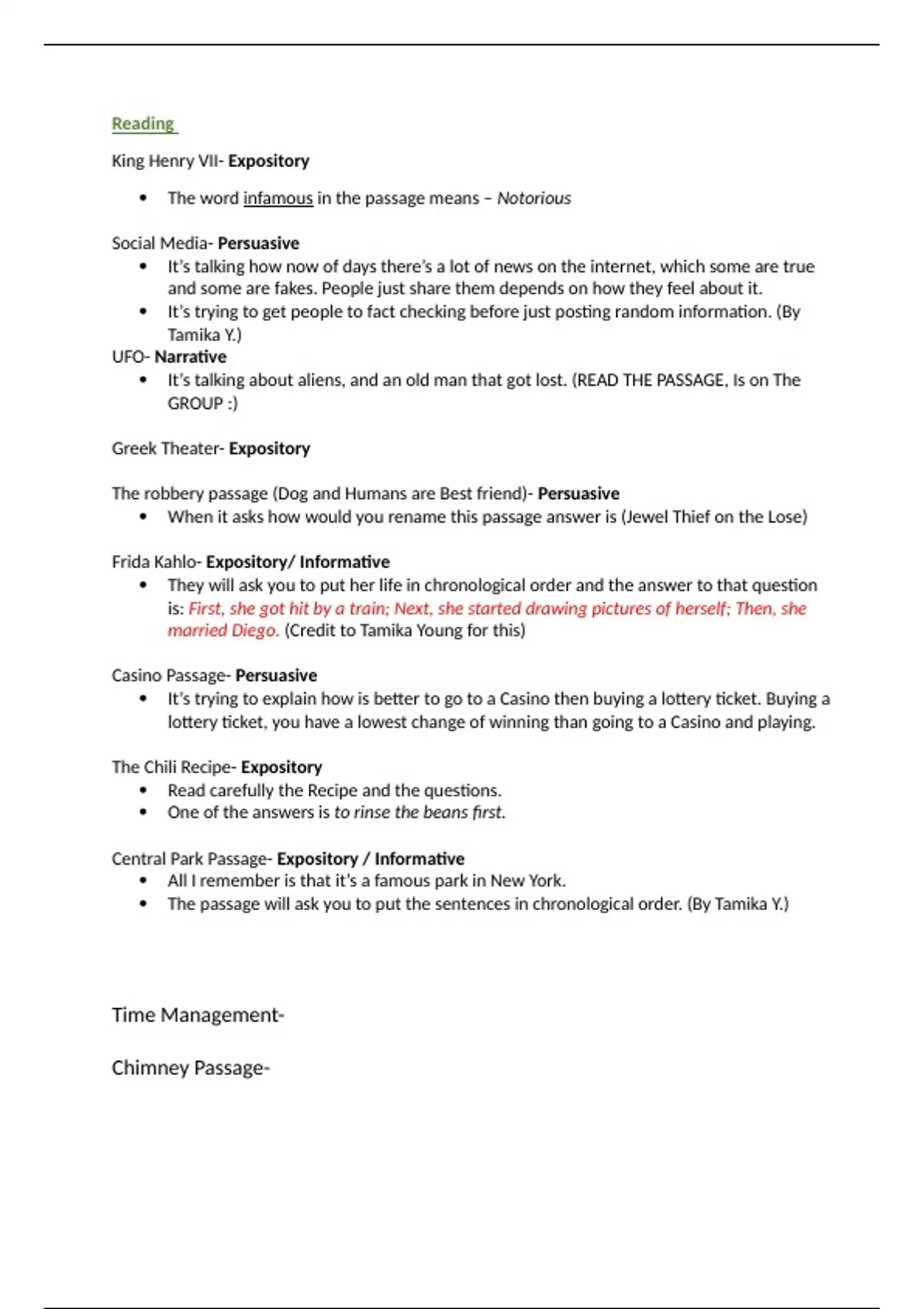 ATI TEAS 7 STUDY GUIDE new update, ATI TEAS 7 STUDY GUIDE Passages that you might have: King Henry VII- Expository ● The word infamous in the passage means – Notorious Social Media- Persuasive ● It’s talking how now of days there’s a lot of news on the internet, which some are true and some are fakes. People just share them depends on how they feel about it. ● It’s trying to get people to fact checking before just posting random information. (By Tamika Y.) UFO- Narrative ● It’s talking about aliens, and an old man that got lost. (READ THE PASSAGE, Is on The GROUP :) Greek Theater- Expository The robbery passage (Dog and Humans are Best friend)- Persuasive ● When it asks how would you rename this passage answer is (Jewel Thief on the Lose) Frida Kahlo- Expository/ Informative ● They will ask you to put her life in chronological order and the answer to that question is: First, she got hit by a train; Next, she started drawing pictures of herself; Then, she married Diego. (Credit to Tamika Young for this) Casino Passage- Persuasive ● It’s trying to explain how is better to go to a Casino then buying a lottery ticket. Buying a lottery ticket, you have a lowest change of winning than going to a Casino and playing. The Chili Recipe- Expository ● Read carefully the Recipe and the questions. ● One of the answers is to rinse the beans first. Central Park Passage- Expository / Informative ● All I remember is that it’s a famous park in New York. ● The passage will ask you to put the sentences in chronological order. (By Tamika Y.) Time Management- Chimney Passage- Type of Passages: ● Expository: Something you find in an academic journal, a recipe, etc. (Very technical) (Teach, Inform, or explain.) ● Technical: Is like following steps to complete something. ● Narrative: Telling a story and entertain ● Persuasive: Making you believe something or to do something. ● Descriptive: Give physical details or provide unique characteristics Most know this: ● Author Purpose: His reason to write a specific topic. ● Theme: The subject to talk, a piece of writing, a person thoughts. ● Topic: that part of a sentence about which something is said. (a conversation) ● Main Idea: Is usually in the first sentence, overall idea of the paragraph. ● Fact: Something that it can be prove is true. ● Opinion: A view or judgment. ● Bia: Against something or someone. ● Compare: two or more ● Inform: Give facts ● Entertain: Fiction ● Express: Feelings ● Stereotypes: A characteristics ascribed to groups of people involving gender, race, origin, etc. ● Cause and Effect: The author describes a situation and then its effects. ● Compare and Contrast: The author explores the similarities and differences between two or more things. ● Chronological: The author list events in the order in which they happened. ● Mood: Influences a reader emotional state in the piece. ● Tone: Describes the author’s attitude toward the topic. To Respond to Questions, you Should know this: ● Almanac: A book that gives you important dates such tidal waves, astronomical events, etc. ● Thesaurus: A dictionary that has definitions, synonyms and antonyms. ● Bibliography: A list of books, magazines, articles, etc. ● Biography: Story of someone written by someone else. ● Autobiography: Story of someone written by the same person.