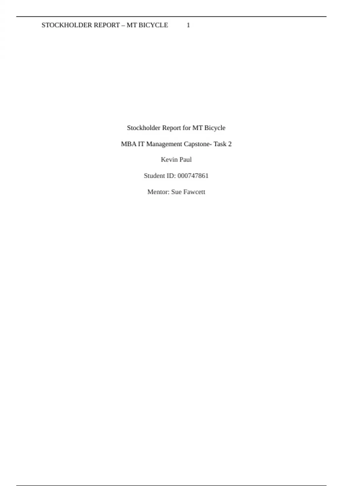 Summary C218 Capstone Task Stockholder Report for Bike s Nouveau MBA IT Management Capstone- Task 2 Stockholder Report – MT Bicycle Stockholder Report Stockholder reports are essential for both large and small corporations as they display the company’s achievement, discloses financial well-being, and highlights plans for the company to shareholders. As such, shareholders can find important information such as the financial health of the company, research and development information, and available plans to launch a new product. Shareholders use this information in investment decision making. The following stockholder report is presented to MT Bicycle stockholders and board of directors for review and justifies the business decisions throughout the simulated business quarters. Also, the report evaluates the current state of the business for all functional areas. The financial well-being for MT Bicycle is reported as stockholders have the right to access information regarding the overall financial state of the company. The stockholder report will also include products and marketing as stockholders are eager to get information concerning any plans to launch a new product to the market. This information is crucial as it provides insight into the productivity of the company in the future. The marketing strategy also illustrates the company’s capacity to identify new potential customers for both new and existing products, identify markets for growth, and also offer the products in new markets. The marketing strategy also gives an insight to the future projections of product sales and distribution. The research and development section will demonstrate the financial viability of MT Bicycle by availing the new ideas and products under development and research to the shareholders. The report on research and development signals MT Bicycle's commitment to ensuring innovation is adopted and well utilized and that the investment in research aligns with the overall marketing and growth strategy. Corporate Strategic Thrusts Several corporate strategic thrusts drove not only financial decisions for MT Bicycle but also non-financial decisions. Corporate strategic thrusts included both Short-term vs. Long-term. In the long-term perspective – MT Bicycle strategic thrusts included the decision to defer profits to build a strong competitive position; willingness to take the risk to get ahead; Market Leadership by being a Smart follower who imitates good ideas; utilize firm's top competitive forces including superior customer value, high visibility, employee empowerment, High-volume, low-cost manufacturing, and Technology leadership. Other strategic thrusts for MT Bicycle included content marketing and direct marketing. MT Bicycle is conscious of the changing investment arena where impact investors are committed to non-financial reporting alongside financial information in their investment decision making. Non-financial disclosure such as environmental impacts, social, and governance behaviour is increasingly becoming crucial to large investors (Junaidi, Triyatmi & Nurdiono, 2012). The leading factors for investors to rule out or reconsider investments are a company’s lack of clear strategy that creates investor value in the short, medium, and long term, poor governance history, and a history or risk of poor environmental performance. Indeed as reported by Mio and Fasan (2013), financial as well as non-financial reporting will be more important in the future, and comprehensive reporting detailing both financial and non-financial disclosure will be the new norm. As such, having a strong management team directly influences the business health, and it is easier to train new employees on the daily business operations and ensure business stability with key employees/talents on board. Having a diversified human capital risk ensures that the company is not overly dependent on selected employees or customers, which would affect the business if they withdrew. Well-elaborated growth potential for markets, customers, and products also impacts the potential investor’s decision. As such, it remains vital that the strategies set by a company influence its financial and non-financial decision. More companies fail as they focus solely on policies that affect their financial decision making, such as measuring the sales revenue trends. However, they tend to forget non-financial information that impacts strategies such as measuring customer loyalty, environmental impacts, and employee commitment. The often ignored non-financial information yields improved management decisions, improved stockholder confidence, credibility, and reduced risks, and enhanced operations (Junaidi, Triyatmi & Nurdiono, 2012).