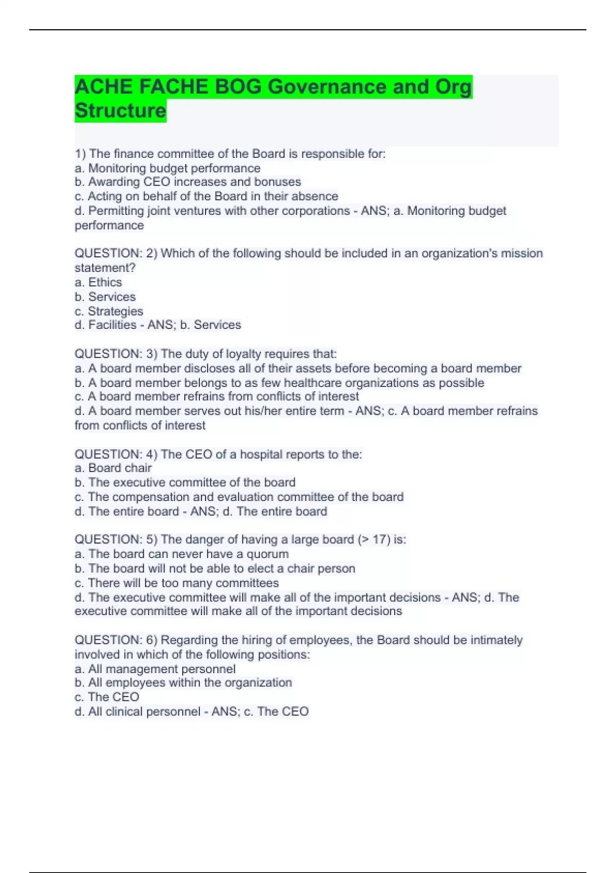 ACHE FACHE BOG Governance and Org S