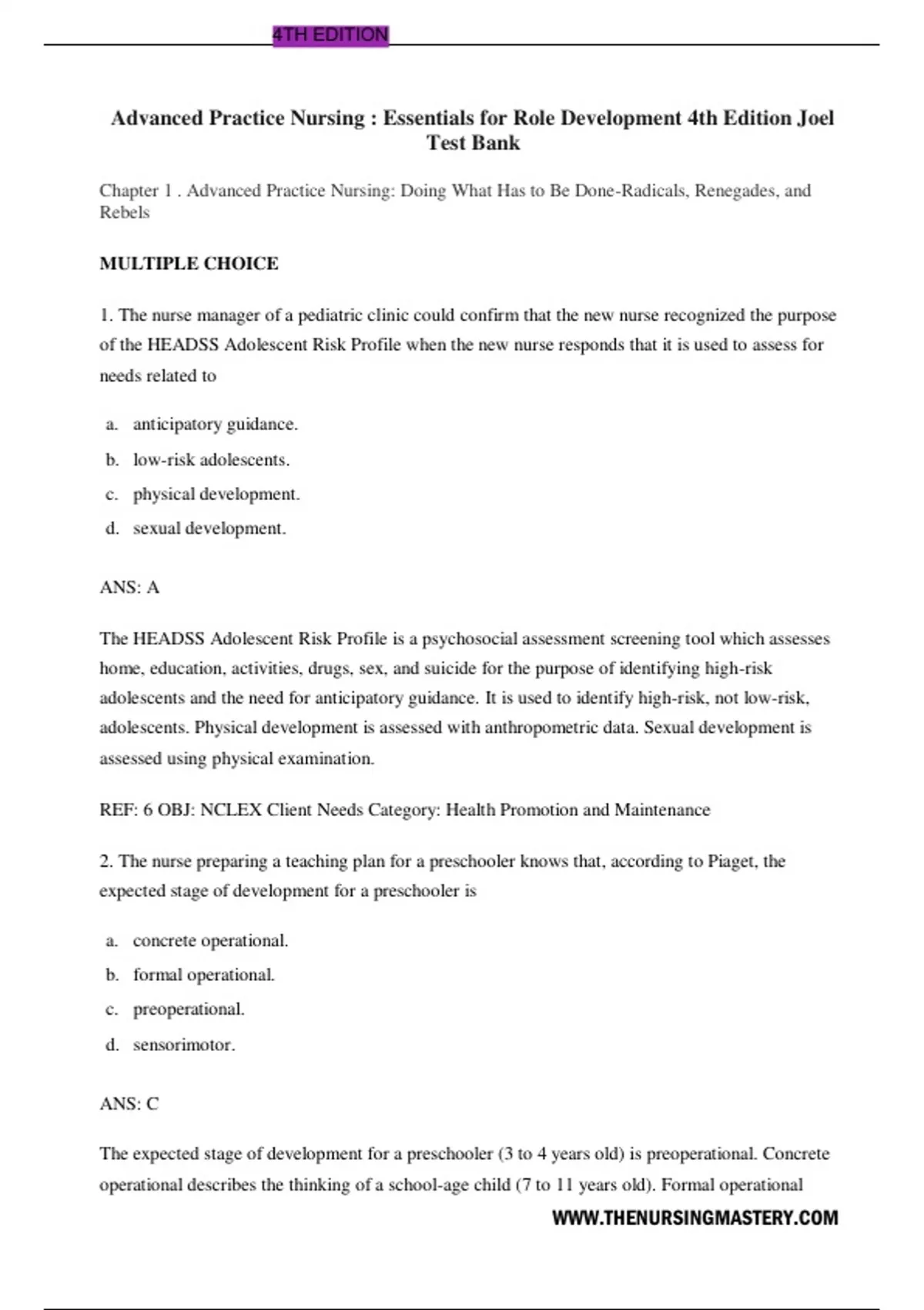 The nurse manager of a pediatric clinic could confirm that the new nurse recognized the purpose of the HEADSS Adolescent Risk Profile when the new nurse responds that it is used to assess for needs related to a. anticipatory guidance. b. low-risk adolescents. c. physical development. d. sexual development. ANS: A The HEADSS Adolescent Risk Profile is a psychosocial assessment screening tool which assesses home, education, activities, drugs, sex, and suicide for the purpose of identifying high-risk adolescents and the need for anticipatory guidance. It is used to identify high-risk, not low-risk, adolescents. Physical development is assessed with anthropometric data. Sexual development is assessed using physical examination. REF: 6 OBJ: NCLEX Client Needs Category: Health Promotion and Maintenance 2. The nurse preparing a teaching plan for a preschooler knows that, according to Piaget, the expected stage of development for a preschooler is a. concrete operational. b. formal operational. c. preoperational. d. sensorimotor. ANS: C The expected stage of development for a preschooler (3 to 4 years old) is preoperational. Concrete operational describes the thinking of a school-age child (7 to 11 years old). Formal operational WWW.THENURSINGMASTERY.COM 4TH EDITION describes the thinking of an individual after about 11 years of age. Sensorimotor describes the earliest pattern of thinking from birth to 2 years old. REF: 5 OBJ: NCLEX Client Needs Category: Health Promotion and Maintenance 3. The school nurse talking with a high school class about the difference between growth and development would best describe growth as a. processes by which early cells specialize. b. psychosocial and cognitive changes. c. qualitative changes associated with aging. d. quantitative changes in size or weight. ANS: D Growth is a quantitative change in which an increase in cell number and size results in an increase in overall size or weight of the body or any of its parts. The processes by which early cells specialize are referred to asdifferentiation. Psychosocial and cognitive changes are referred to as development. Qualitative changes associated with aging are referred to as maturation. REF: 2 OBJ: NCLEX Client Needs Category: Health Promotion and Maintenance 4. The most appropriate response of the nurse when a mother asks what the Denver II does is that it a. can diagnose developmental disabilities. b. identifies a need for physical therapy. c. is a developmental screening tool. d. provides a framework for health teaching. ANS: C The Denver II is the most commonly used measure of developmental status used by health care professionals; it is a screening tool. Screening tools do not provide a diagnosis. Diagnosis requires a thorough neurodevelopment history and physical examination. Developmental delay, which is suggested by screening, is a symptom, not a diagnosis. The need for any therapy would be identified with a comprehensive evaluation, not a screening tool. Some providers use the Denver II as a framework for teaching about expected development, but this is not the primary purpose of the tool. WWW.THENURSINGMASTERY.COM REF: 4 OBJ: NCLEX Client Needs Category: Health Promotion and Maintenance 5. To plan early intervention and care for an infant with Down syndrome, the nurse considers knowledge of other physical development exemplars such as a. cerebral palsy. b. failure to thrive. c. fetal alcohol syndrome. d. hydrocephaly. ANS: D Hydrocephaly is also a physical development exemplar. Cerebral palsy is an exemplar of adaptive developmental delay. Failure to thrive is an exemplar of social/emotional developmental delay. Fetal alcohol syndrome is an exemplar of cognitive developmental delay. REF: 9 OBJ: NCLEX Client Needs Category: Health Promotion and Maintenance 6. To plan early intervention and care for a child with a developmental delay, the nurse would consider knowledge of the concepts most significantly impacted by development, including a. culture. b. environment. c. functional status. d. nutrition. ANS: C Function is one of the concepts most significantly impacted by development. Others include sensory-perceptual, cognition, mobility, reproduction, and sexuality. Knowledge of these concepts can help the nurse anticipate areas that need to be addressed. Culture is a concept that is considered to significantly affect development; the difference is the concepts that affect development are those that represent major influencing factors (causes), hence determination of development and would be the focus of preventive interventions. Environment is considered to significantly affect development. Nutrition is considered to significantly affect development. REF: 1 OBJ: NCLEX Client Needs Category: Health Promotion and Maintenance