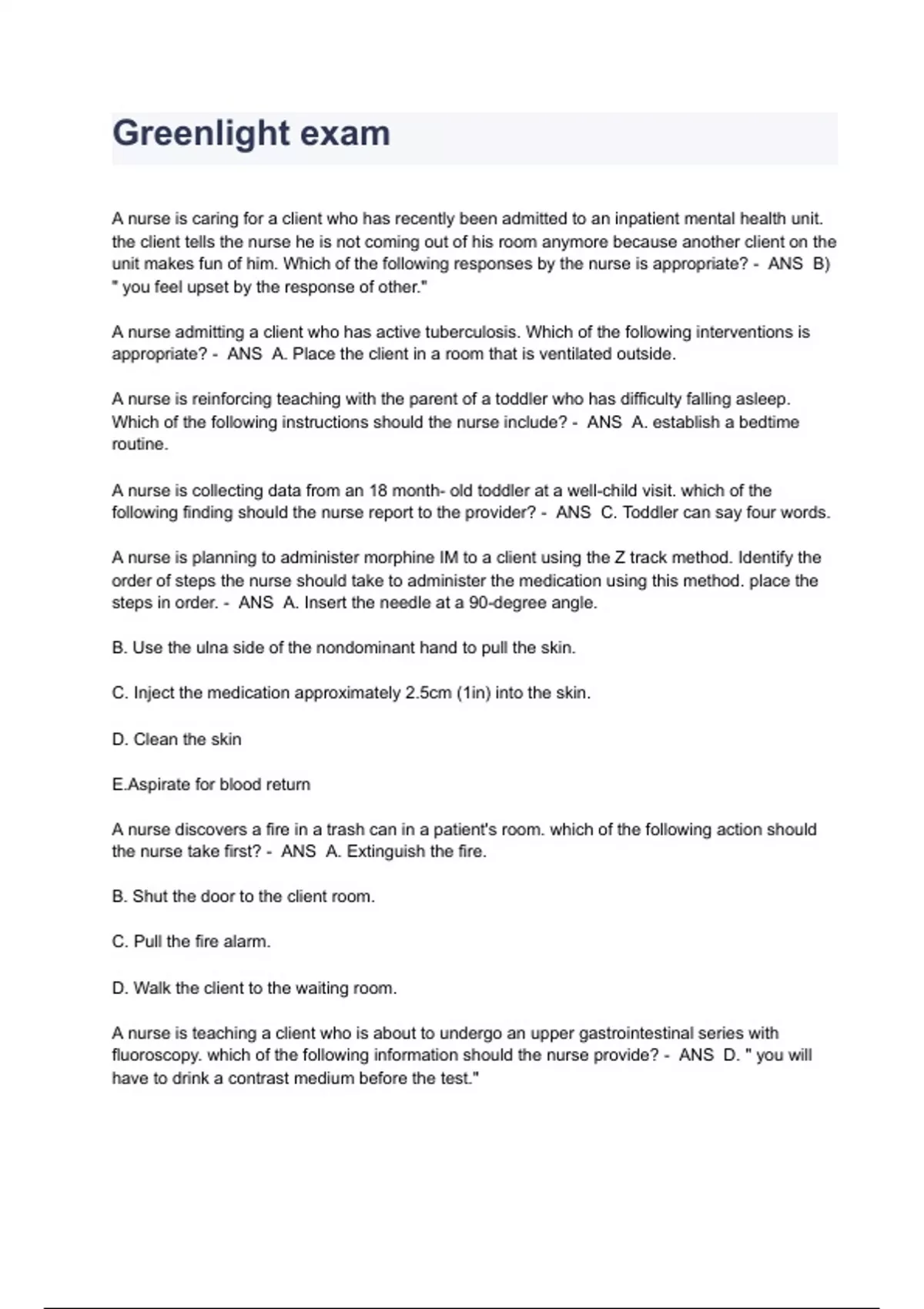 Greenlight exam Questions And Answers All Verified A nurse is caring for a client who has recently been admitted to an inpatient mental health unit. the client tells the nurse he is not coming out of his room anymore because another client on the unit makes fun of him. Which of the following responses by the nurse is appropriate? - ANS B) " you feel upset by the response of other." A nurse admitting a client who has active tuberculosis. Which of the following interventions is appropriate? - ANS A. Place the client in a room that is ventilated outside. A nurse is reinforcing teaching with the parent of a toddler who has difficulty falling asleep. Which of the following instructions should the nurse include? - ANS A. establish a bedtime routine. A nurse is collecting data from an 18 month- old toddler at a well-child visit. which of the following finding should the nurse report to the provider? - ANS C. Toddler can say four words. A nurse is planning to administer morphine IM to a client using the Z track method. Identify the order of steps the nurse should take to administer the medication using this method. place the steps in order. - ANS A. Insert the needle at a 90-degree angle. B. Use the ulna side of the nondominant hand to pull the skin. C. Inject the medication approximately 2.5cm (1in) into the skin. D. Clean the skin E.Aspirate for blood return A nurse discovers a fire in a trash can in a patient's room. which of the following action should the nurse take first? - ANS A. Extinguish the fire. B. Shut the door to the client room. C. Pull the fire alarm. D. Walk the client to the waiting room. A nurse is teaching a client who is about to undergo an upper gastrointestinal series with fluoroscopy. which of the following information should the nurse provide? - ANS D. " you will have to drink a contrast medium before the test."