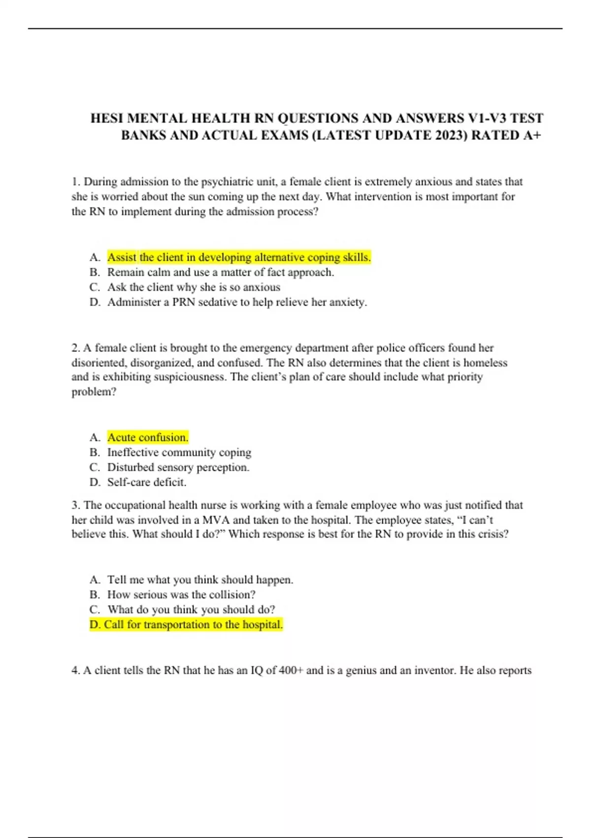 HESI MENTAL HEALTH RN QUESTIONS AND ANSWERS V1-V3 TEST BANKS AND ACTUAL EXAMS (LATEST UPDATE 2023) RATED A+ 1.During admission to the psychiatric unit, a female client is extremely anxious and states that she is worried about the sun coming up the next day. What intervention is most important for the RN to implement during the admission process? A.Assist the client in developing alternative coping skills. B.Remain calm and use a matter of fact approach. C.Ask the client why she is so anxious D.Administer a PRN sedative to help relieve her anxiety. 2.A female client is brought to the emergency department after police officers found her disoriented, disorganized, and confused. The RN also determines that the client is homeless and is exhibiting suspiciousness. The client’s plan of care should include what priority problem? A.Acute confusion. B.Ineffective community coping C.Disturbed sensory perception. D.Self-care deficit. 3.The occupational health nurse is working with a female employee who was just notified that her child was involved in a MVA and taken to the hospital. The employee states, “I can’t believe this. What should I do?” Which response is best for the RN to provide in this crisis? A.Tell me what you think should happen. B.How serious was the collision? C.What do you think you should do? D. Call for transportation to the hospital.