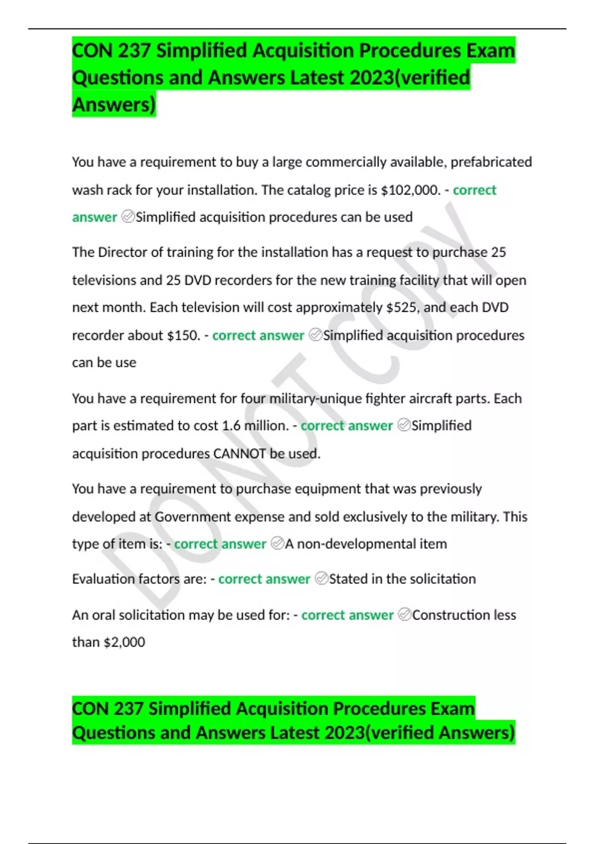CON 237 Simplified Acquisition Procedures Exam Questions and Answers Latest 2023(verified Answers)