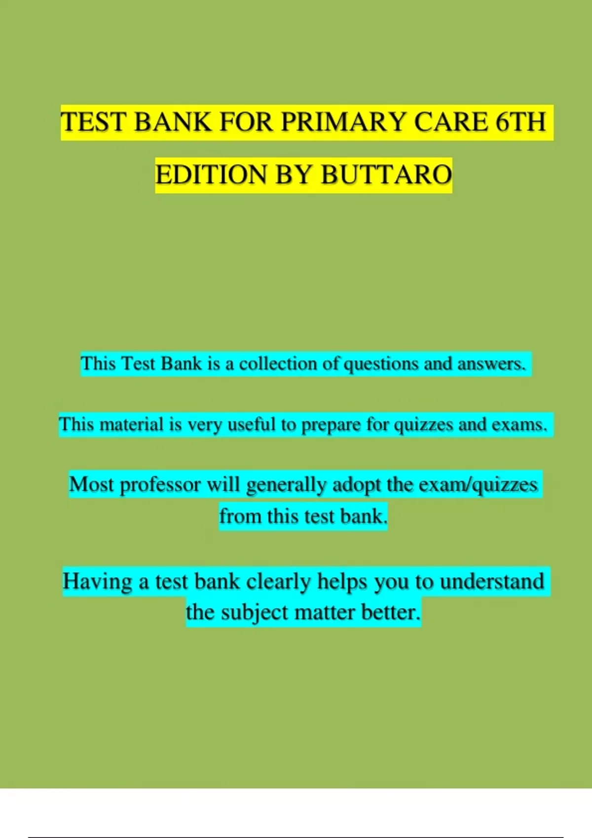TEST BANK FOR PRIMARY CARE : A COLLABORATIVE PRACTICE,6TH EDITION BY BUTTARO Chapter 1 - 228 | 100 % Complete TEST BANK FOR PRIMARY CARE : A COLLABORATIVE PRACTICE,6TH EDITION BY BUTTARO Chapter 1 - 228 | 100 % Complete