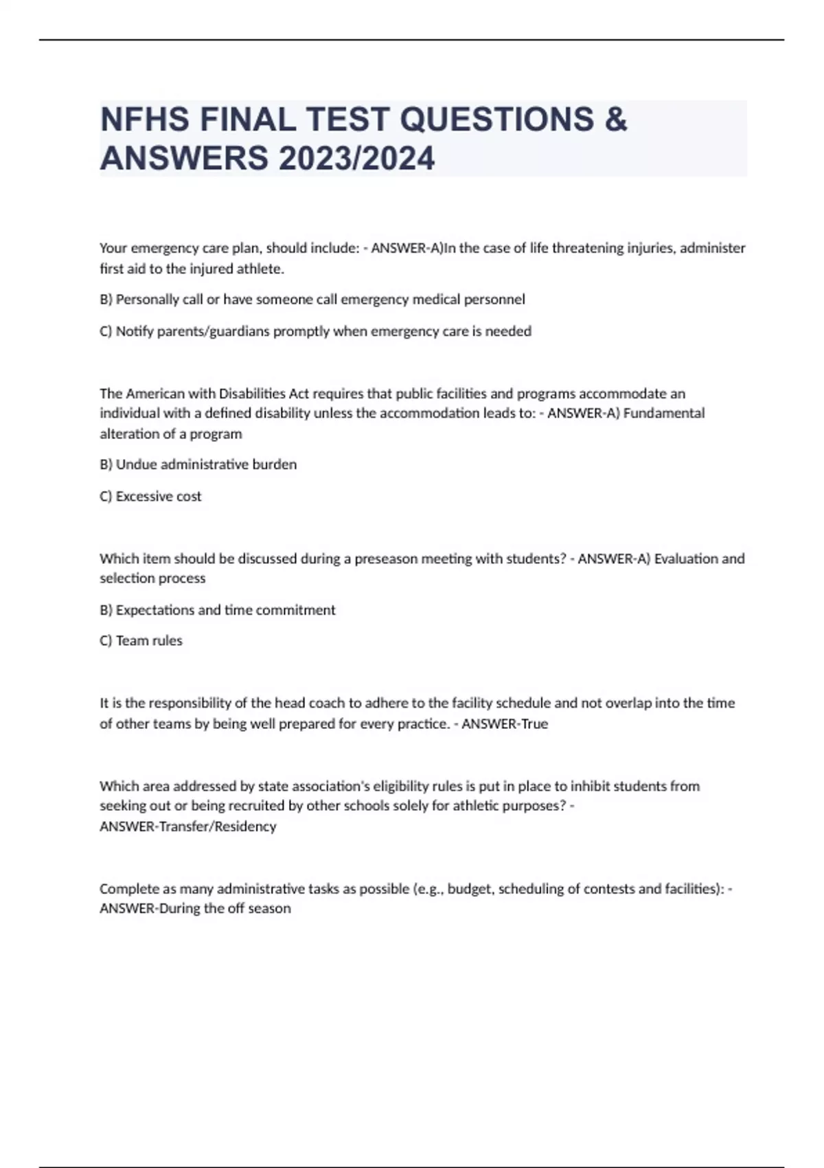 NFHS FINAL TEST QUESTIONS & ANSWERS 2023/2024 Your emergency care plan, should include: - ANSWER-A)In the case of life threatening injuries, administer first aid to the injured athlete. B) Personally call or have someone call emergency medical personnel C) Notify parents/guardians promptly when emergency care is needed The American with Disabilities Act requires that public facilities and programs accommodate an individual with a defined disability unless the accommodation leads to: - ANSWER-A) Fundamental alteration of a program B) Undue administrative burden C) Excessive cost Which item should be discussed during a preseason meeting with students? - ANSWER-A) Evaluation and selection process B) Expectations and time commitment C) Team rules It is the responsibility of the head coach to adhere to the facility schedule and not overlap into the time of other teams by being well prepared for every practice. - ANSWER-True Which area addressed by state association's eligibility rules is put in place to inhibit students from seeking out or being recruited by other schools solely for athletic purposes? - ANSWER-Transfer/Residency Complete as many administrative tasks as possible (e.g., budget, scheduling of contests and facilities): - ANSWER-During the off season
