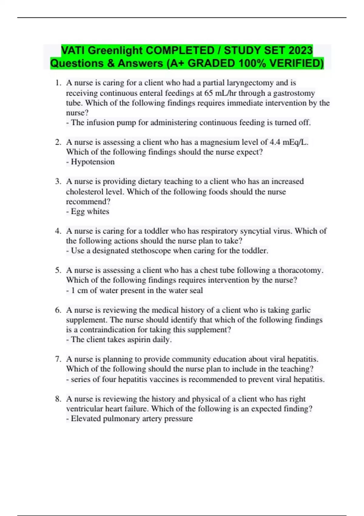1. A nurse is caring for a client who had a partial laryngectomy and is receiving continuous enteral feedings at 65 mL/hr through a gastrostomy tube. Which of the following findings requires immediate intervention by the nurse? - The infusion pump for administering continuous feeding is turned off. 2. A nurse is assessing a client who has a magnesium level of 4.4 mEq/L. Which of the following findings should the nurse expect? - Hypotension 3. A nurse is providing dietary teaching to a client who has an increased cholesterol level. Which of the following foods should the nurse recommend? - Egg whites 4. A nurse is caring for a toddler who has respiratory syncytial virus. Which of the following actions should the nurse plan to take? - Use a designated stethoscope when caring for the toddler. 5. A nurse is assessing a client who has a chest tube following a thoracotomy. Which of the following findings requires intervention by the nurse? - 1 cm of water present in the water seal 6. A nurse is reviewing the medical history of a client who is taking garlic supplement. The nurse should identify that which of the following findings is a contraindication for taking this supplement? - The client takes aspirin daily. 7. A nurse is planning to provide community education about viral hepatitis. Which of the following should the nurse plan to include in the teaching? - series of four hepatitis vaccines is recommended to prevent viral hepatitis. 8. A nurse is reviewing the history and physical of a client who has right ventricular heart failure. Which of the following is an expected finding? - Elevated pulmonary artery pressure 9. A home health nurse is conducting an initial home visit for a client who has terminal breast cancer. The client has two school-age children and a limited support system. Which of the following is the priority nursing action? - Inform the client of available community resources. 10. A nurse is providing postoperative teaching to a client who has a newly-inserted pacemaker. Which of the following statements by the client indicates that the teaching has been effective? - "I will use my cell phone on the ear opposite of my pacemaker." 11. A nurse is caring for a client who has heart failure and has started taking a loop diuretic. Which of the following findings indicates the client is experiencing an adverse effect of the medication? - Decreased reflexes 12. A nurse is caring for a client who has neutropenia due to HIV. Which of the following precautions should the nurse take while caring for this client? - Wear an N95 respirator. 13. A nurse manager is presenting information to the nursing staff regarding the appropriate use of client restraints. Which of the following should the nurse include? (Select all that apply.) - The nurse should pad the bony prominences. The nurse should remove the restraints every 2 hr. The provider's prescription should include the 14. A nurse is providing discharge teaching about disease prevention to a client who has active tuberculosis. Which of the following should the nurse include? - Educating the client how to cover nose and mouth with tissues when coughing 15. A nurse is caring for a client who reports difficulty falling asleep at night. Which of the following actions should the nurse take? - Schedule routine care tasks during hours when the client is awake.