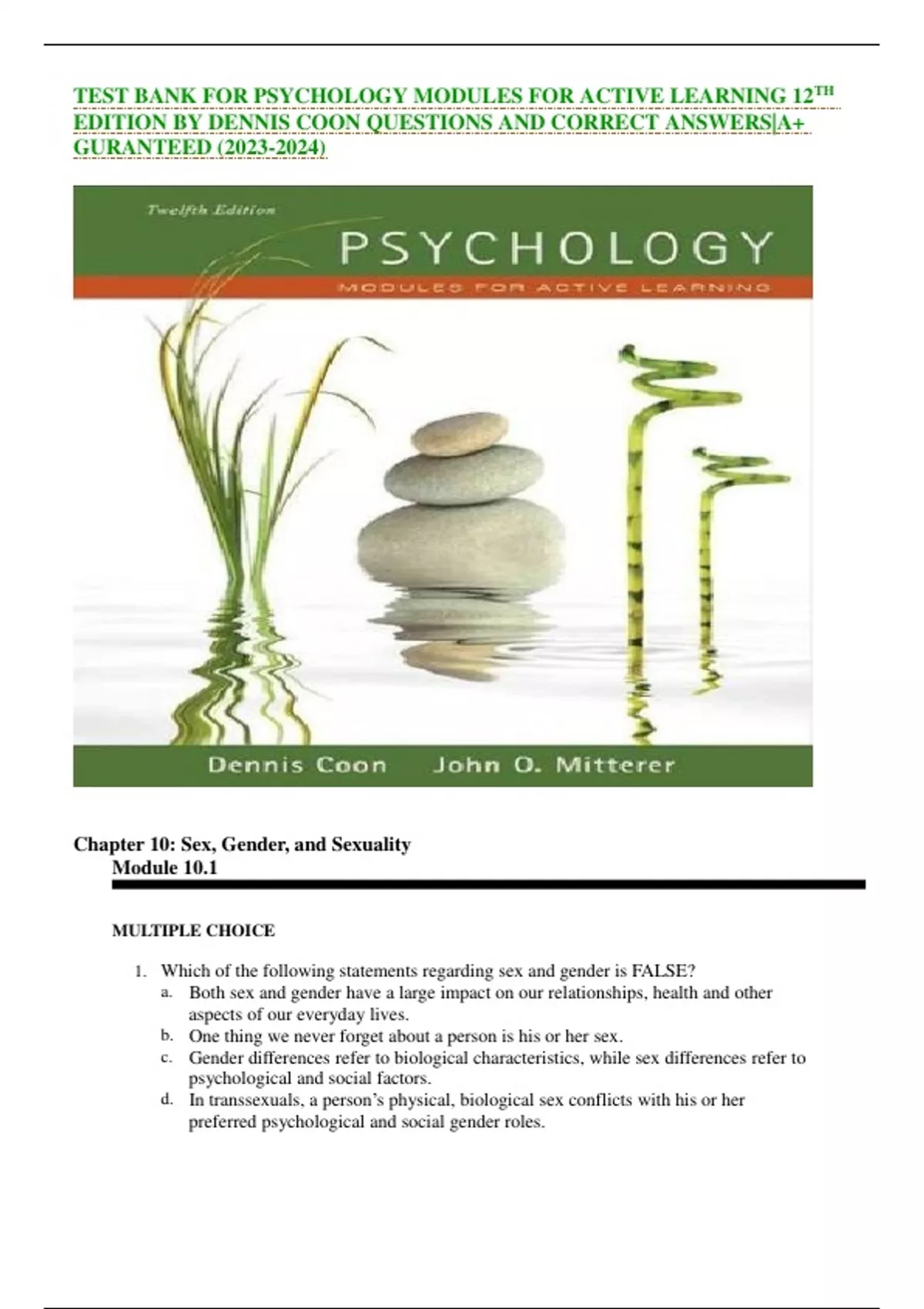 TEST BANK FOR PSYCHOLOGY MODULES FOR ACTIVE LEARNING 12TH EDITION BY DENNIS COON QUESTIONS AND CORRECT ANSWERS|A+ GURANTEED ()