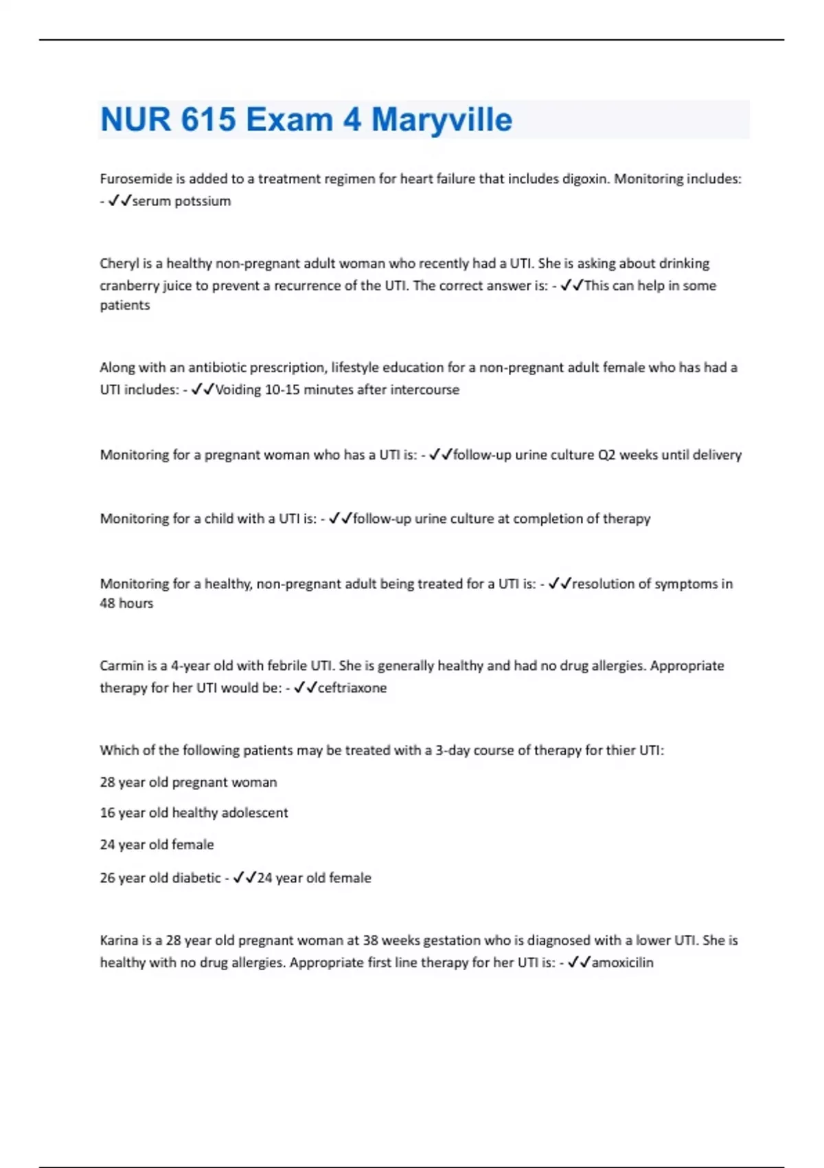Furosemide is added to a treatment regimen for heart failure that includes digoxin. Monitoring includes: - serum potssium Cheryl is a healthy non-pregnant adult woman who recently had a UTI. She is asking about drinking cranberry juice to prevent a recurrence of the UTI. The correct answer is: - This can help in some patients Along with an antibiotic prescription, lifestyle education for a non-pregnant adult female who has had a UTI includes: - Voiding 10-15 minutes after intercourse Monitoring for a pregnant woman who has a UTI is: - follow-up urine culture Q2 weeks until delivery Monitoring for a child with a UTI is: - follow-up urine culture at completion of therapy Monitoring for a healthy, non-pregnant adult being treated for a UTI is: - resolution of symptoms in 48 hours Carmin is a 4-year old with febrile UTI. She is generally healthy and had no drug allergies. Appropriate therapy for her UTI would be: - ceftriaxone Which of the following patients may be treated with a 3-day course of therapy for thier UTI: 28 year old pregnant woman 16 year old healthy adolescent 24 year old female 26 year old diabetic - 24 year old female Karina is a 28 year old pregnant woman at 38 weeks gestation who is diagnosed with a lower UTI. She is healthy with no drug allergies. Appropriate first line therapy for her UTI is: - amoxicilinLaurel is a 24 year old female with a UTI. She is healthy, afebrie, and only drug allergy is to sulfa, which gives her a rash. An appropriate first line of therapy is: - ciprofloxacin