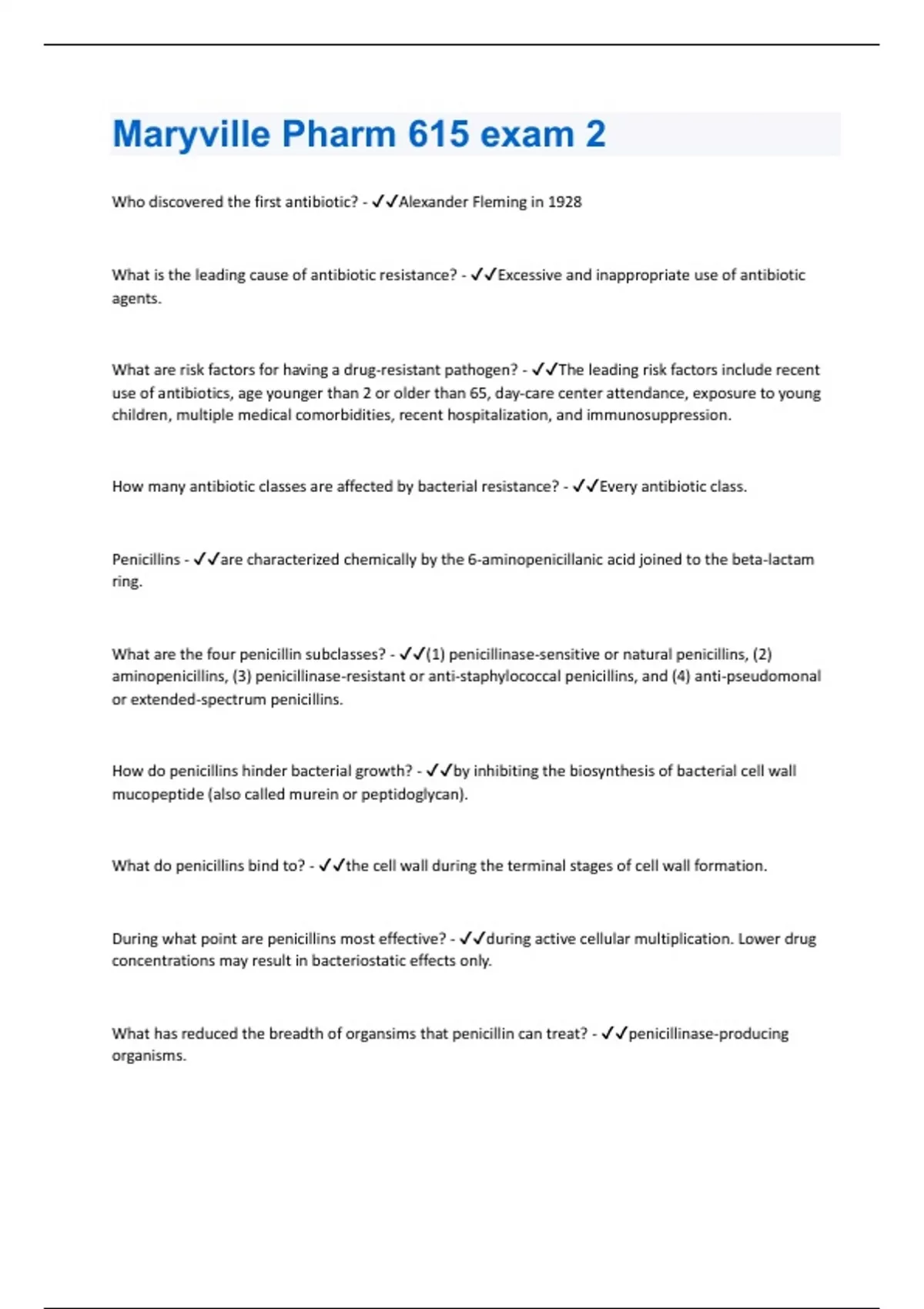 Who discovered the first antibiotic? - Alexander Fleming in 1928 What is the leading cause of antibiotic resistance? - Excessive and inappropriate use of antibiotic agents. What are risk factors for having a drug-resistant pathogen? - The leading risk factors include recent use of antibiotics, age younger than 2 or older than 65, day-care center attendance, exposure to young children, multiple medical comorbidities, recent hospitalization, and immunosuppression. How many antibiotic classes are affected by bacterial resistance? - Every antibiotic class. Penicillins - are characterized chemically by the 6-aminopenicillanic acid joined to the beta-lactam ring. What are the four penicillin subclasses? - (1) penicillinase-sensitive or natural penicillins, (2) aminopenicillins, (3) penicillinase-resistant or anti-staphylococcal penicillins, and (4) anti-pseudomonal or extended-spectrum penicillins. How do penicillins hinder bacterial growth? - by inhibiting the biosynthesis of bacterial cell wall mucopeptide (also called murein or peptidoglycan). What do penicillins bind to? - the cell wall during the terminal stages of cell wall formation. During what point are penicillins most effective? - during active cellular multiplication. Lower drug concentrations may result in bacteriostatic effects only. What has reduced the breadth of organsims that penicillin can treat? - penicillinase-producing organisms.What is the only natural penicillin commercially available? - penicillin. What is penicillin (naturally occurring type) active against? - aerobic, gram-positive organisms. Name aminopenicillins. - ampicillin and amoxicillan. What are aminopenicillins active against? - gram-positive organism, and greater activity against gram-negative bacteria because of their enhanced ability to penetrate the outer membrane of these organisms