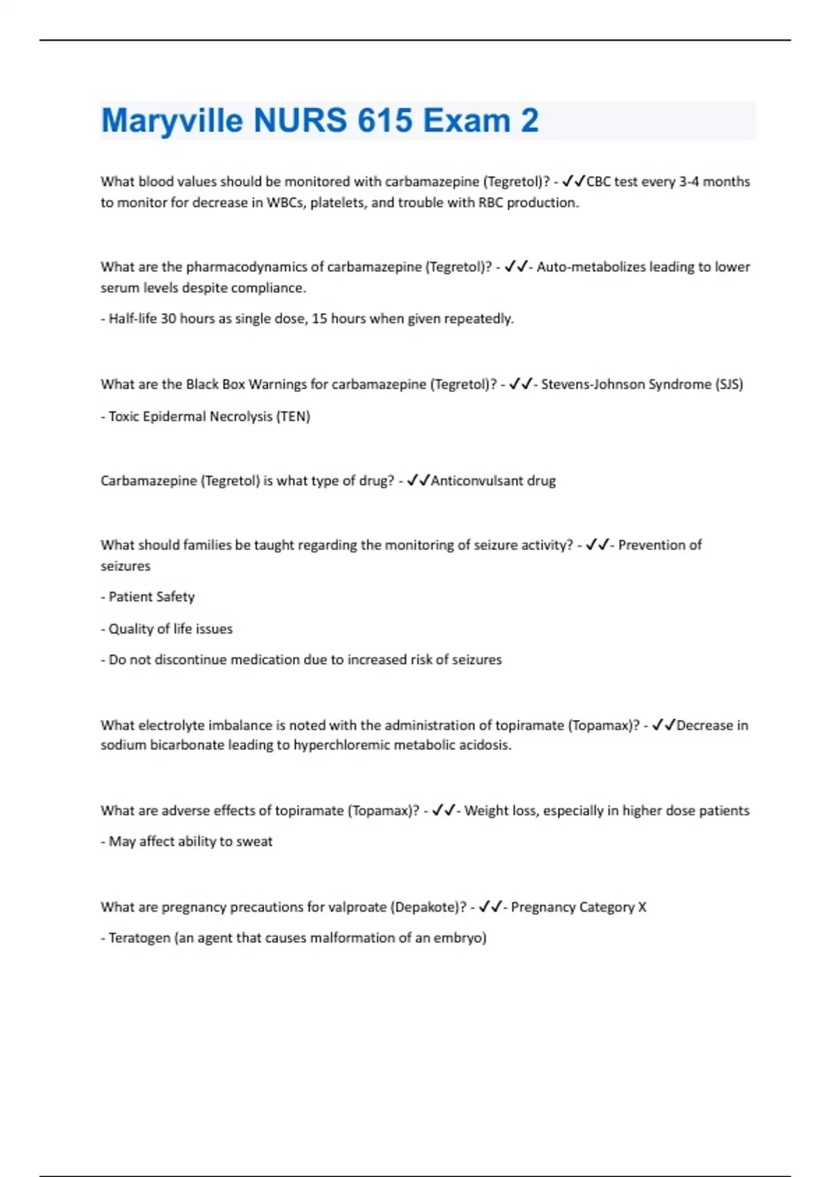 What blood values should be monitored with carbamazepine (Tegretol)? - CBC test every 3-4 months to monitor for decrease in WBCs, platelets, and trouble with RBC production. What are the pharmacodynamics of carbamazepine (Tegretol)? - - Auto-metabolizes leading to lower serum levels despite compliance. - Half-life 30 hours as single dose, 15 hours when given repeatedly. What are the Black Box Warnings for carbamazepine (Tegretol)? - - Stevens-Johnson Syndrome (SJS) - Toxic Epidermal Necrolysis (TEN) Carbamazepine (Tegretol) is what type of drug? - Anticonvulsant drug What should families be taught regarding the monitoring of seizure activity? - - Prevention of seizures - Patient Safety - Quality of life issues - Do not discontinue medication due to increased risk of seizures What electrolyte imbalance is noted with the administration of topiramate (Topamax)? - Decrease in sodium bicarbonate leading to hyperchloremic metabolic acidosis. What are adverse effects of topiramate (Topamax)? - - Weight loss, especially in higher dose patients - May affect ability to sweat What are pregnancy precautions for valproate (Depakote)? - - Pregnancy Category X - Teratogen (an agent that causes malformation of an embryo)What instructions will you provide to a woman who wants to get pregnant and has a seizure disorder controlled with valproate (Depakote)? - - Pregnant women should be advised to switch to another anticonvulsant during the first trimester, such as levetiracetam (Keppra), then switch back to volproate (Depakote) in the second trimester. - All anticonvulsants for pregnant women should be monitored by a high-risk obstetrician. What are precautions and contraindications for tricyclic antidepressants? - - Caution cardiac disease patients (may act as an antiarrhythmic) - HTN, tachycardia, and convulsions when used with MAOIs