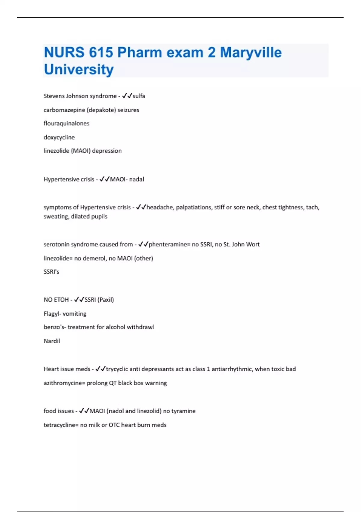 Stevens Johnson syndrome - sulfa carbomazepine (depakote) seizures flouraquinalones doxycycline linezolide (MAOI) depression Hypertensive crisis - MAOI- nadal symptoms of Hypertensive crisis - headache, palpatiations, stiff or sore neck, chest tightness, tach, sweating, dilated pupils serotonin syndrome caused from - phenteramine= no SSRI, no St. John Wort linezolide= no demerol, no MAOI (other) SSRI's NO ETOH - SSRI (Paxil) Flagyl- vomiting benzo's- treatment for alcohol withdrawl Nardil Heart issue meds - trycyclic anti depressants act as class 1 antiarrhythmic, when toxic bad azithromycine= prolong QT black box warning food issues - MAOI (nadol and linezolid) no tyramine tetracycline= no milk or OTC heart burn medssexual med side effects - SNRI= abnormal ejaculation SSRI= sexual side effects Hepatitis - can be caused with tetracycline ethambutal pyrazmine (#1 cause of hepatitis drug induced) Lupus - can be caused from Tetracycline diarrhea - can be caused by phentermine