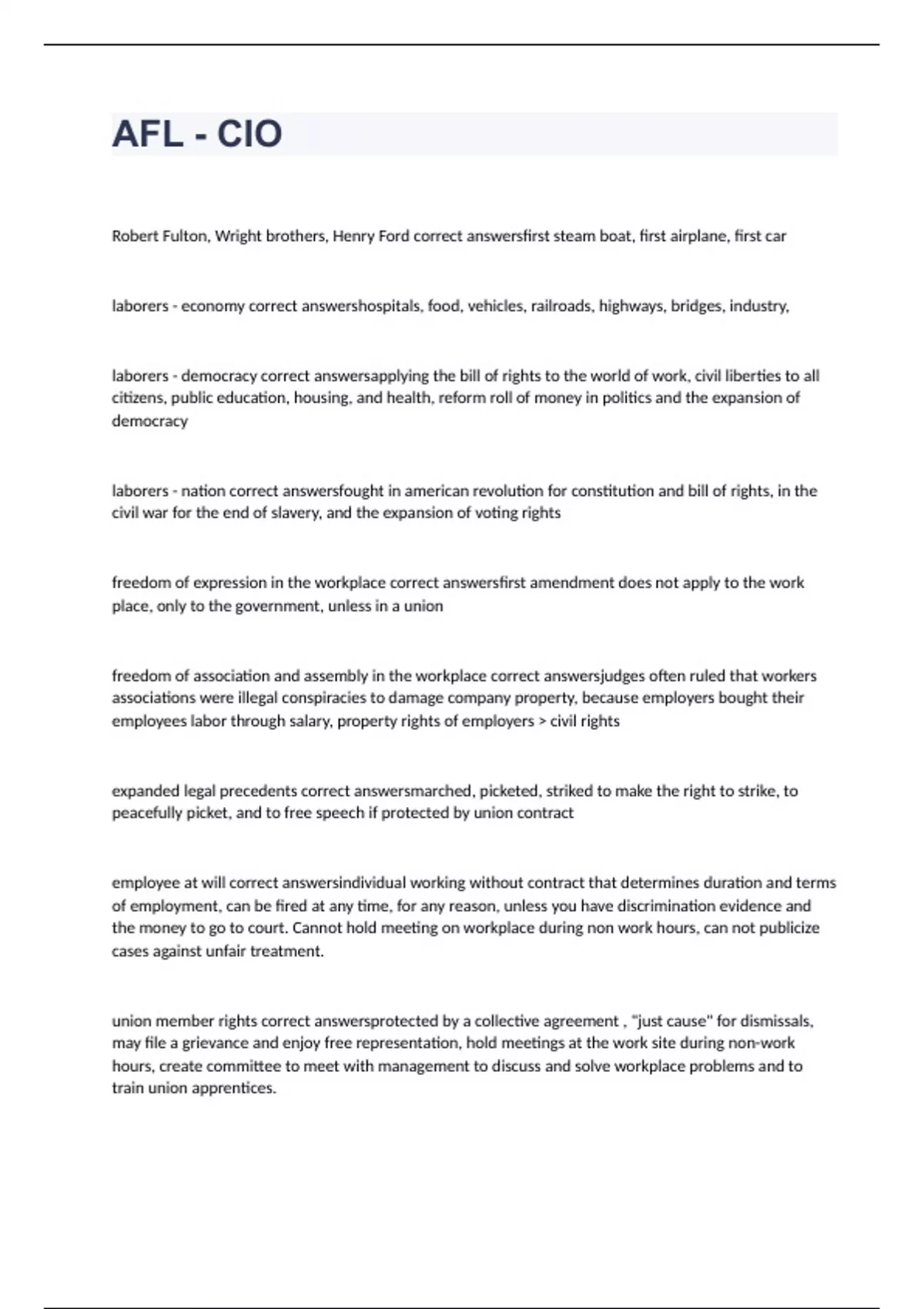 Robert Fulton, Wright brothers, Henry Ford correct answersfirst steam boat, first airplane, first car laborers - economy correct answershospitals, food, vehicles, railroads, highways, bridges, industry, laborers - democracy correct answersapplying the bill of rights to the world of work, civil liberties to all citizens, public education, housing, and health, reform roll of money in politics and the expansion of democracy laborers - nation correct answersfought in american revolution for constitution and bill of rights, in the civil war for the end of slavery, and the expansion of voting rights freedom of expression in the workplace correct answersfirst amendment does not apply to the work place, only to the government, unless in a union freedom of association and assembly in the workplace correct answersjudges often ruled that workers associations were illegal conspiracies to damage company property, because employers bought their employees labor through salary, property rights of employers > civil rights expanded legal precedents correct answersmarched, picketed, striked to make the right to strike, to peacefully picket, and to free speech if protected by union contract employee at will correct answersindividual working without contract that determines duration and terms of employment, can be fired at any time, for any reason, unless you have discrimination evidence and the money to go to court. Cannot hold meeting on workplace during non work hours, can not publicize cases against unfair treatment.