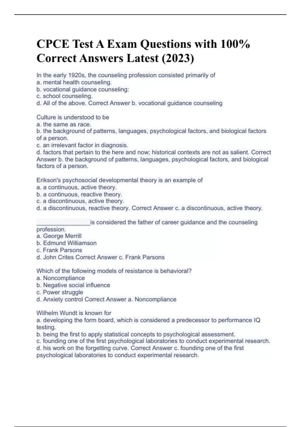 In the early 1920s, the counseling profession consisted primarily of a. mental health counseling. b. vocational guidance counseling: c. school counseling. d. All of the above. Correct Answer b. vocational guidance counseling Culture is understood to be a. the same as race. b. the background of patterns, languages, psychological factors, and biological factors of a person. c. an irrelevant factor in diagnosis. d. factors that pertain to the here and now; historical contexts are not as salient. Correct Answer b. the background of patterns, languages, psychological factors, and biological factors of a person. Erikson's psychosocial developmental theory is an example of a. a continuous, active theory. b. a continuous, reactive theory. c. a discontinuous, active theory. d. a discontinuous, reactive theory. Correct Answer c. a discontinuous, active theory. ________________is considered the father of career guidance and the counseling profession. a. George Merrill b. Edmund Williamson c. Frank Parsons d. John Crites Correct Answer c. Frank Parsons Which of the following models of resistance is behavioral? a. Noncompliance b. Negative social influence c. Power struggle d. Anxiety control Correct Answer a. Noncompliance Wilhelm Wundt is known for a. developing the form board, which is considered a predecessor to performance IQ testing. b. being the first to apply statistical concepts to psychological assessment. c. founding one of the first psychological laboratories to conduct experimental research. d. his work on the forgetting curve. Correct Answer c. founding one of the first psychological laboratories to conduct experimental research.
