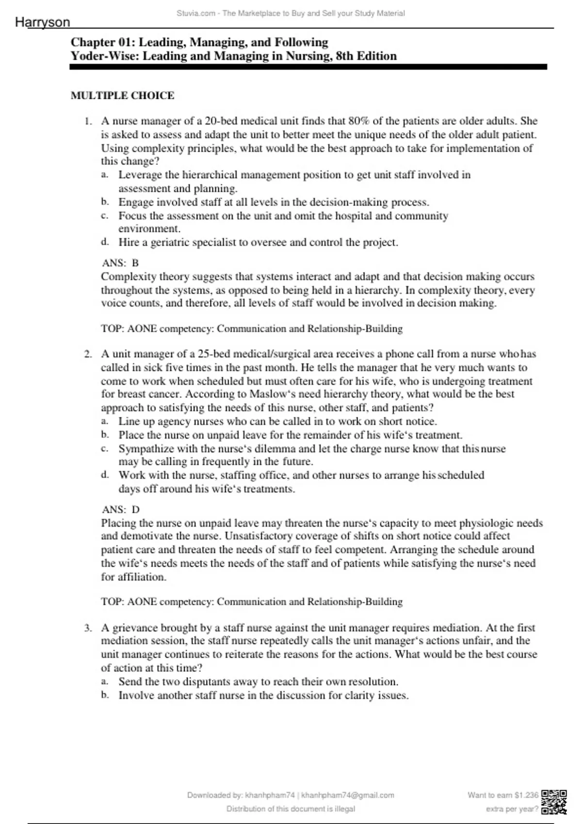 Chapter 01: Leading, Managing, and Following Yoder-Wise: Leading and Managing in Nursing, 8th Edition MULTIPLE CHOICE 1. A nurse manager of a 20-bed medical unit finds that 80% of the patients are older adults. She is asked to assess and adapt the unit to better meet the unique needs of the older adult patient. Using complexity principles, what would be the best approach to take for implementation of this change? a. Leverage the hierarchical management position to get unit staff involved in assessment and planning. b. Engage involved staff at all levels in the decision-making process. c. Focus the assessment on the unit and omit the hospital and community environment. d. Hire a geriatric specialist to oversee and control the project. ANS: B Complexity theory suggests that systems interact and adapt and that decision making occurs throughout the systems, as opposed to being held in a hierarchy. In complexity theory, every voice counts, and therefore, all levels of staff would be involved in decision making. TOP: AONE competency: Communication and Relationship-Building 2. A unit manager of a 25-bed medical/surgical area receives a phone call from a nurse who has called in sick five times in the past month. He tells the manager that he very much wants to come to work when scheduled but must often care for his wife, who is undergoing treatment for breast cancer. According toUMaSslowN’sTneed hiOerarchy theory, what would be the best approach to satisfying the needs of this nurse, other staff, and patients? a. Line up agency nurses who can be called in to work on short notice. b. Place the nurse on unpaid leave for the remainder of his wife’s treatment. c. Sympathize with the nurse’s dilemma and let the charge nurse know that this nurse may be calling in frequently in the future. d. Work with the nurse, staffing office, and other nurses to arrange his scheduled days off around his wife’s treatments. ANS: D Placing the nurse on unpaid leave may threaten the nurse’s capacity to meet physiologic needs and demotivate the nurse. Unsatisfactory coverage of shifts on short notice could affect patient care and threaten the needs of staff to feel competent. Arranging the schedule around the wife’s needs meets the needs of the staff and of patients while satisfying the nurse’s need for affiliation. TOP: AONE competency: Communication and Relationship-Building 3. A grievance brought by a staff nurse against the unit manager requires mediation. At the first mediation session, the staff nurse repeatedly calls the unit manager’s actions unfair, and the unit manager continues to reiterate the reasons for the actions. What would be the best course of action at this time? a. Send the two disputants away to reach their own resolution. b. Involve another staff nurse in the discussion for clarity issues. Harryson NURS 4803 Exam 1 new/Leading and Managing in Nursing 7th Edition Yoder-Wise Test Bank U S N T O c. Ask each party to examine their own motives and issues in the conflict. d. Continue to listen as the parties repeat their thoughts and feelings about the conflict. ANS: C For resolution of conflict, one should address the interests and involvement of participants in the conflict by examining the real issues of all parties. TOP: AONE competency: Communication and Relationship-Building 4. At a second negotiation session, the unit manager and staff nurse are unable to reach a resolution. What is the appropriate next step? a. Arrange another meeting in a week’s time so as to allow a cooling-off period. b. Elevate the next negation session to the next manager, one level above. c. Insist that participants continue to talk until a resolution has been reached. d. Back the unit manager’s actions and end the dispute. ANS: B Part of leadership is understanding conflict resolution and ability to negotiate and manage for resolution of issues and concerns. This situation has failed a second negotiation session, elevation to a manager with additional training to facilitate conflict resolution is important at this point. TOP: AONE competency: Communication and Relationship-Building 5. The manager of a surgical area has a vision for the future that requires the addition of RN assistants or unlicensed persons to feed, bathe, and ambulate patients. The RNs on the staff have always practiced in a prNimaRry nIursiGng-BCveryMsystem and are very resistant to this idea. What would be the best initial strategy for implementation of this change? a. Exploring the values and feelings of the RN group in relationship to this change b. Leaving the RNs alone for a time so they can think about the change before it is implemented c. Dropping the idea and trying for the change in a year or so when some of the present RNs have retired d. Hiring the assistants and allowing the RNs to see what good additions they are ANS: A Influencing others requires emotional intelligence in domains such as empathy, handling relationships, deepening self-awareness in self and others, motivating others, and managing emotions. Motivating others recognizes that values are powerful forces that influence acceptance of change. Leaving the RNs alone for a period of time before implementation does not provide opportunity to explore different perspectives and values. Avoiding discussion until the team changes may not promote adoption of the change until there is opportunity to explore perspectives and values related to the change. Hiring of the assistants demonstrates lack of empathy for the perspectives of the RN staff. TOP: AONE competency: Knowledge of the Health Care Environment