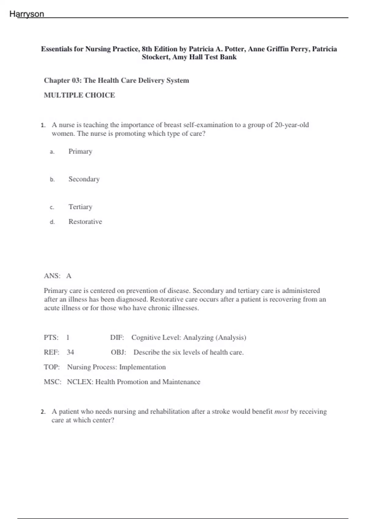 Essentials for nursing practice 8th edition by patricia a potter anne griffin perry patricia stockert amy hall test bankEssentials for Nursing Practice, 8th Edition by Patricia A. Potter, Anne Griffin Perry, Patricia Stockert, Amy Hall Test Bank Chapter 03: The Health Care Delivery System MULTIPLE CHOICE 1. A nurse is teaching the importance of breast self-examination to a group of 20-year-old women. The nurse is promoting which type of care? a. Primary b. Secondary c. Tertiary d. Restorative ANS: A Primary care is centered on prevention of disease. Secondary and tertiary care is administered after an illness has been diagnosed. Restorative care occurs after a patient is recovering from an acute illness or for those who have chronic illnesses. PTS: 1 DIF: Cognitive Level: Analyzing (Analysis) REF: 34 OBJ: Describe the six levels of health care. TOP: Nursing Process: Implementation MSC: NCLEX: Health Promotion and Maintenance 2. A patient who needs nursing and rehabilitation after a stroke would benefit most by receiving care at which center? Harryson a. Primary care center b. Restorative care center c. Assisted living center d. Respite center ANS: B Restorative care centers provide rehabilitation and nursing care. In primary care centers, health promotion is the major theme. Assisted living centers offer long-term assistance with activities of daily living. Respite centers offer short-term relief to persons who provide full-time care to an older adult. PTS: 1 DIF: Cognitive Level: Applying (Application) REF: 33 OBJ: Explain the relationship between levels of health care and levels of prevention. TOP: Nursing Process: Evaluation MSC: NCLEX: Health Promotion and Maintenance 3. A patient states that he or she cannot afford health care insurance for the family because of a low income. What is the best form of insurance available for this patient? a. Medicaid b. Medicare c. Private insurance