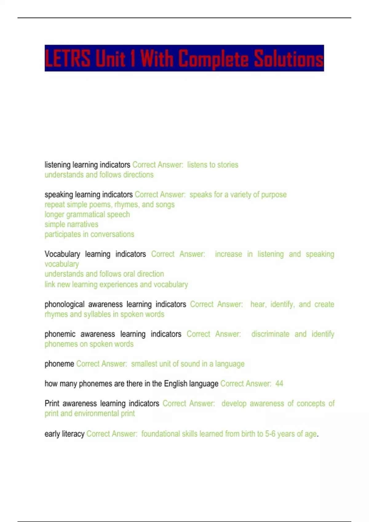 LETRS Unit 1 With Complete Solutions listening learning indicators Correct Answer: listens to stories understands and follows directions speaking learning indicators Correct Answer: speaks for a variety of purpose repeat simple poems, rhymes, and songs longer grammatical speech simple narratives participates in conversations Vocabulary learning indicators Correct Answer: increase in listening and speaking vocabulary understands and follows oral direction link new learning experiences and vocabulary phonological awareness learning indicators Correct Answer: hear, identify, and create rhymes and syllables in spoken words phonemic awareness learning indicators Correct Answer: discriminate and identify phonemes on spoken words phoneme Correct Answer: smallest unit of sound in a language