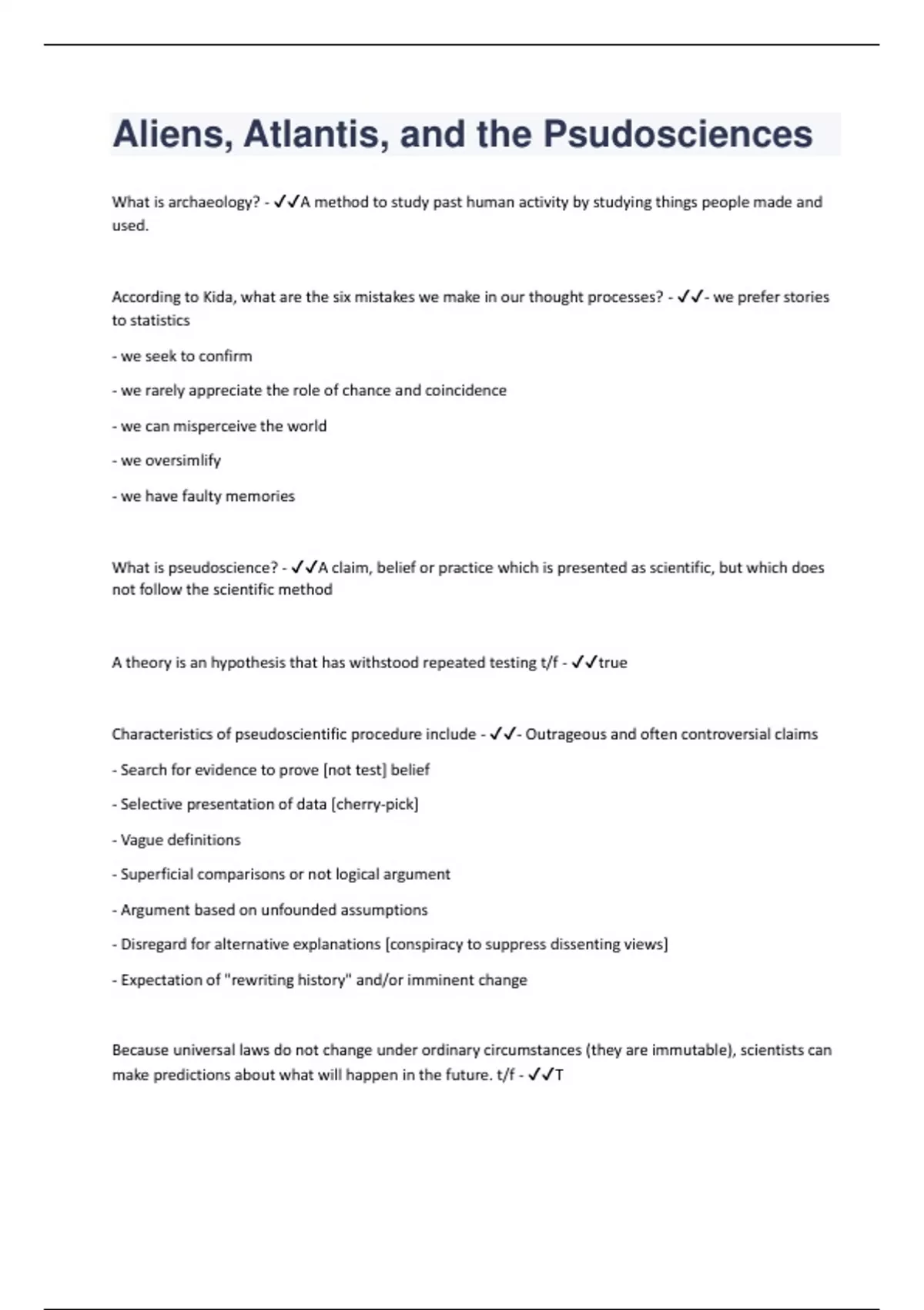 What is archaeology? - A method to study past human activity by studying things people made and used. According to Kida, what are the six mistakes we make in our thought processes? - - we prefer stories to statistics - we seek to confirm - we rarely appreciate the role of chance and coincidence - we can misperceive the world - we oversimlify - we have faulty memories What is pseudoscience? - A claim, belief or practice which is presented as scientific, but which does not follow the scientific method A theory is an hypothesis that has withstood repeated testing t/f - true Characteristics of pseudoscientific procedure include - - Outrageous and often controversial claims - Search for evidence to prove [not test] belief - Selective presentation of data [cherry-pick] - Vague definitions - Superficial comparisons or not logical argument - Argument based on unfounded assumptions - Disregard for alternative explanations [conspiracy to suppress dissenting views] - Expectation of "rewriting history" and/or imminent change Because universal laws do not change under ordinary circumstances (they are immutable), scientists can make predictions about what will happen in the future. t/f - T