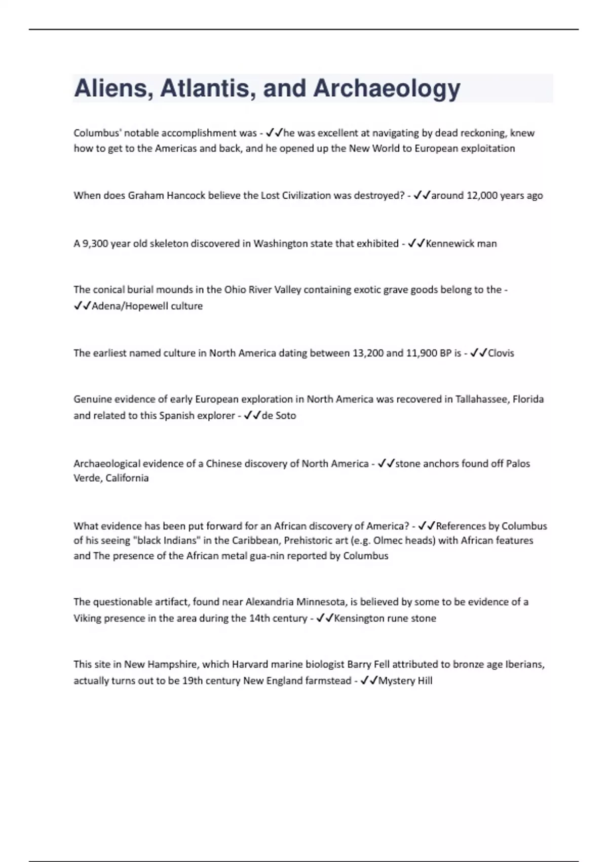 Columbus' notable accomplishment was - he was excellent at navigating by dead reckoning, knew how to get to the Americas and back, and he opened up the New World to European exploitation When does Graham Hancock believe the Lost Civilization was destroyed? - around 12,000 years ago A 9,300 year old skeleton discovered in Washington state that exhibited - Kennewick man The conical burial mounds in the Ohio River Valley containing exotic grave goods belong to the - Adena/Hopewell culture The earliest named culture in North America dating between 13,200 and 11,900 BP is - Clovis Genuine evidence of early European exploration in North America was recovered in Tallahassee, Florida and related to this Spanish explorer - de Soto Archaeological evidence of a Chinese discovery of North America - stone anchors found off Palos Verde, California What evidence has been put forward for an African discovery of America? - References by Columbus of his seeing "black Indians" in the Caribbean, Prehistoric art (e.g. Olmec heads) with African features and The presence of the African metal gua-nin reported by Columbus The questionable artifact, found near Alexandria Minnesota, is believed by some to be evidence of a Viking presence in the area during the 14th century - Kensington rune stone This site in New Hampshire, which Harvard marine biologist Barry Fell attributed to bronze age Iberians, actually turns out to be 19th century New England farmstead - Mystery Hill