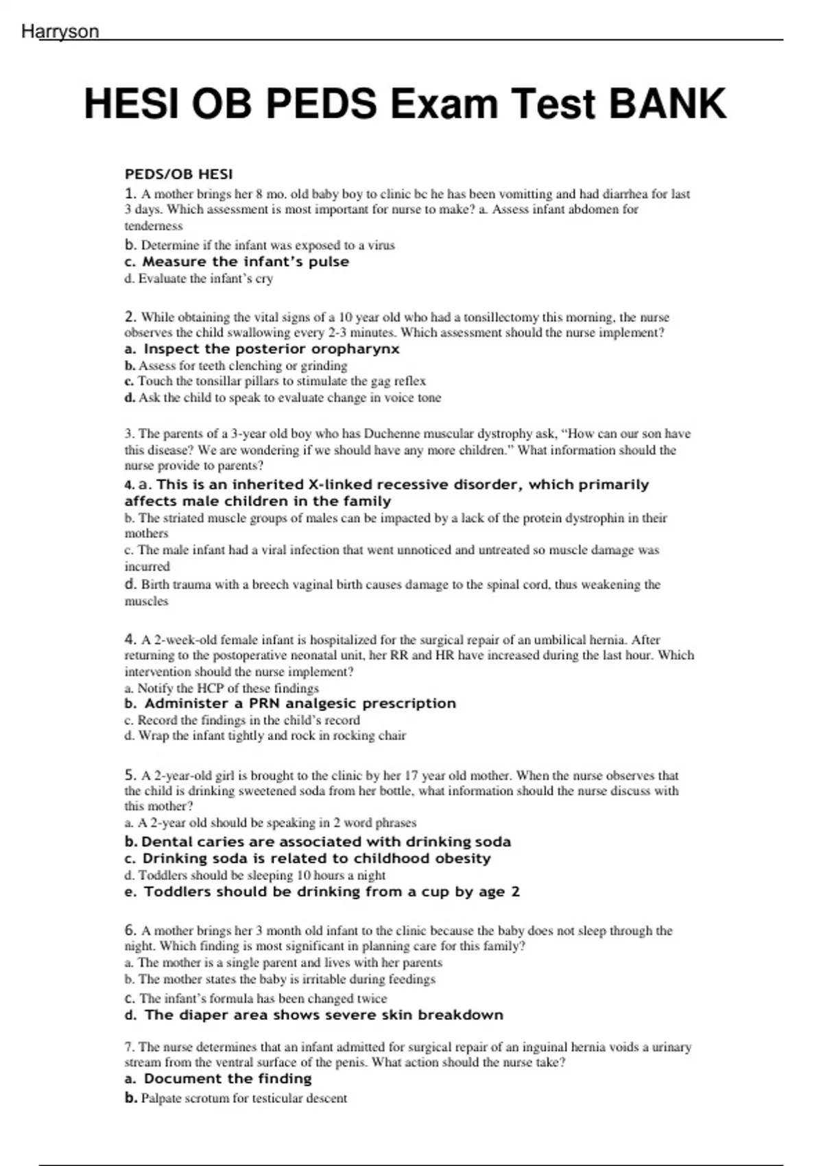 Hesi ob peds exam test bankHESI OB PEDS Exam Test BANK PEDS/OB HESI 1. A mother brings her 8 mo. old baby boy to clinic bc he has been vomitting and had diarrhea for last 3 days. Which assessment is most important for nurse to make? a. Assess infant abdomen for tenderness b. Determine if the infant was exposed to a virus c. Measure the infant’s pulse d. Evaluate the infant’s cry 2. While obtaining the vital signs of a 10 year old who had a tonsillectomy this morning, the nurse observes the child swallowing every 2-3 minutes. Which assessment should the nurse implement? a. Inspect the posterior oropharynx b. Assess for teeth clenching or grinding c. Touch the tonsillar pillars to stimulate the gag reflex d. Ask the child to speak to evaluate change in voice tone 3. The parents of a 3-year old boy who has Duchenne muscular dystrophy ask, “How can our son have this disease? We are wondering if we should have any more children.” What information should the nurse provide to parents? 4. a. This is an inherited X-linked recessive disorder, which primarily affects male children in the family b. The striated muscle groups of males can be impacted by a lack of the protein dystrophin in their mothers c. The male infant had a viral infection that went unnoticed and untreated so muscle damage was incurred d. Birth trauma with a breech vaginal birth causes damage to the spinal cord, thus weakening the muscles 4. A 2-week-old female infant is hospitalized for the surgical repair of an umbilical hernia. After returning to the postoperative neonatal unit, her RR and HR have increased during the last hour. Which intervention should the nurse implement? a. Notify the HCP of these findings b. Administer a PRN analgesic prescription c. Record the findings in the child’s record d. Wrap the infant tightly and rock in rocking chair 5. A 2-year-old girl is brought to the clinic by her 17 year old mother. When the nurse observes that the child is drinking sweetened soda from her bottle, what information should the nurse discuss with this mother? a. A 2-year old should be speaking in 2 word phrases b. Dental caries are associated with drinking soda c. Drinking soda is related to childhood obesity d. Toddlers should be sleeping 10 hours a night e. Toddlers should be drinking from a cup by age 2 6. A mother brings her 3 month old infant to the clinic because the baby does not sleep through the night. Which finding is most significant in planning care for this family? a. The mother is a single parent and lives with her parents b. The mother states the baby is irritable during feedings c. The infant’s formula has been changed twice d. The diaper area shows severe skin breakdown 7. The nurse determines that an infant admitted for surgical repair of an inguinal hernia voids a urinary stream from the ventral surface of the penis. What action should the nurse take? a. Document the finding b. Palpate scrotum for testicular descent