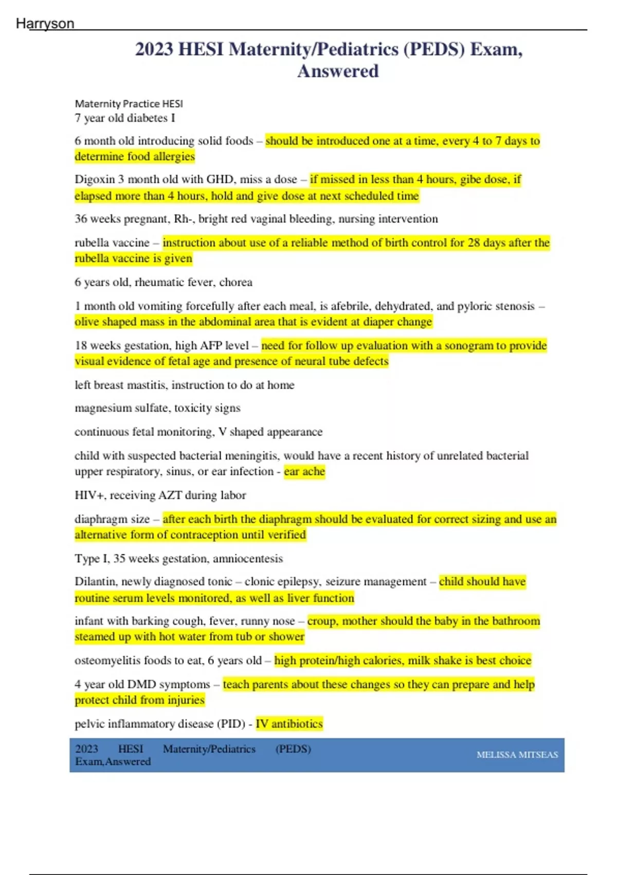 2023 hesi maternity pediatrics peds exam answered2023 HESI Maternity/Pediatrics (PEDS) Exam, Answered 2023 HESI Maternity/Pediatrics (PEDS) Exam,Answered MELISSA MITSEAS Maternity Practice HESI 7 year old diabetes I 6 month old introducing solid foods – should be introduced one at a time, every 4 to 7 days to determine food allergies Digoxin 3 month old with GHD, miss a dose – if missed in less than 4 hours, gibe dose, if elapsed more than 4 hours, hold and give dose at next scheduled time 36 weeks pregnant, Rh-, bright red vaginal bleeding, nursing intervention rubella vaccine – instruction about use of a reliable method of birth control for 28 days after the rubella vaccine is given 6 years old, rheumatic fever, chorea 1 month old vomiting forcefully after each meal, is afebrile, dehydrated, and pyloric stenosis – olive shaped mass in the abdominal area that is evident at diaper change 18 weeks gestation, high AFP level – need for follow up evaluation with a sonogram to provide visual evidence of fetal age and presence of neural tube defects left breast mastitis, instruction to do at home magnesium sulfate, toxicity signs continuous fetal monitoring, V shaped appearance child with suspected bacterial meningitis, would have a recent history of unrelated bacterial upper respiratory, sinus, or ear infection - ear ache HIV+, receiving AZT during labor diaphragm size – after each birth the diaphragm should be evaluated for correct sizing and use an alternative form of contraception until verified Type I, 35 weeks gestation, amniocentesis Dilantin, newly diagnosed tonic – clonic epilepsy, seizure management – child should have routine serum levels monitored, as well as liver function infant with barking cough, fever, runny nose – croup, mother should the baby in the bathroom steamed up with hot water from tub or shower osteomyelitis foods to eat, 6 years old – high protein/high calories, milk shake is best choice 4 year old DMD symptoms – teach parents about these changes so they can prepare and help protect child from injuries pelvic inflammatory disease (PID) - IV antibiotics