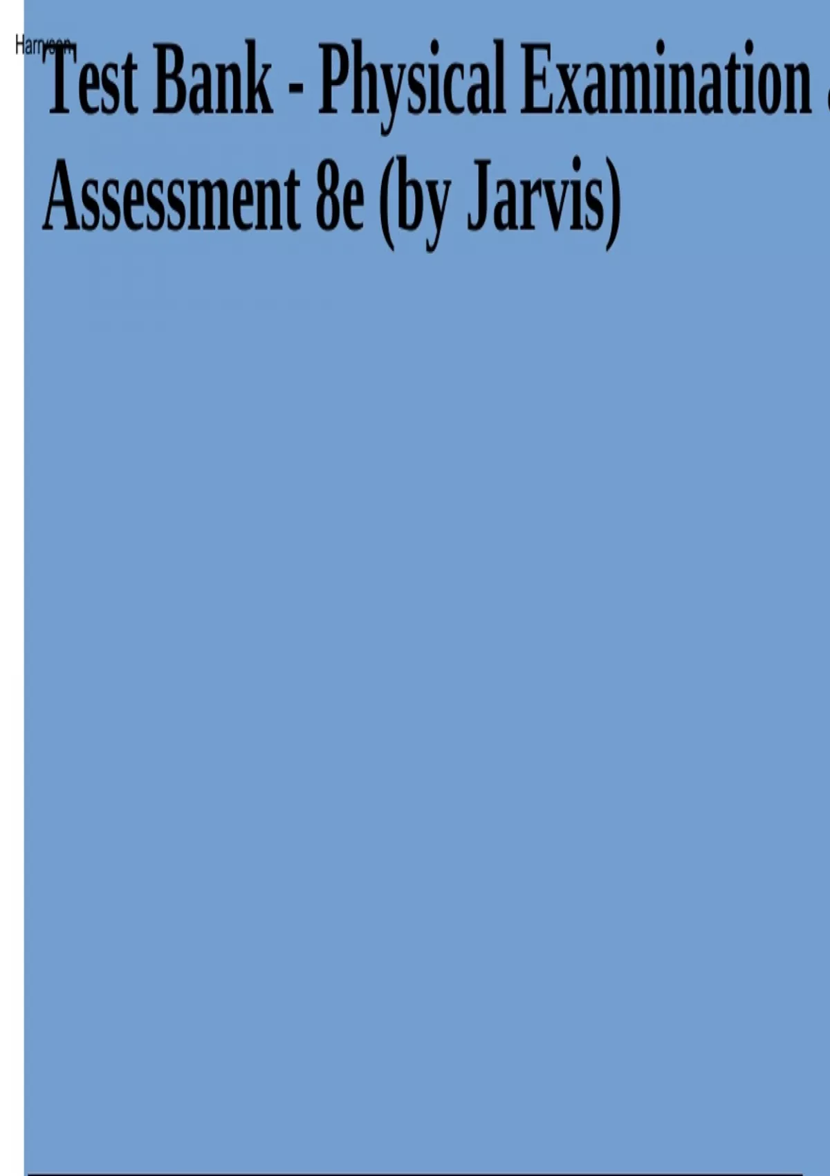 Test bank physical examination and health assessment 8th edition Test Bank - Physical Examination and Health Assessment 8e (by Jarvis) Harryson NURSINGTB.COM Chapter 01: Evidence-Based Assessment MULTIPLE CHOICE 1. After completing an initial assessment of a patient, the nurse has charted that his respirations are eupneic and his pulse is 58 beats per minute. These types of data would be: a. Objective. b. Reflective. c. Subjective. d. Introspective. ANS: A Objective data are what the health professional observes by inspecting, percussing, palpating, and auscultating during the physical examination. Subjective data is what the person says about him or herself during history taking. The terms reflective and introspective are not used to describe data. DIF: Cognitive Level: Understanding (Comprehension) MSC: Client Needs: Safe and Effective Care Environment: Management of Care 2. A patient tells the nurse that he is very nervous, is nauseated, and feels hot. These types of data would be: a. Objective. b. Reflective. c. Subjective. d. Introspective. ANS: C Subjective data are what the person says about him or herself during history taking. Objective data are what the health professional observes by inspecting, percussing, palpating, and auscultating during the physical examination. The terms reflective and introspective are not used to describe data. DIF: Cognitive Level: Understanding (Comprehension) MSC: Client Needs: Safe and Effective Care Environment: Management of Care 3. The patients record, laboratory studies, objective data, and subjective data combine to form the: a. Data base. b. Admitting data