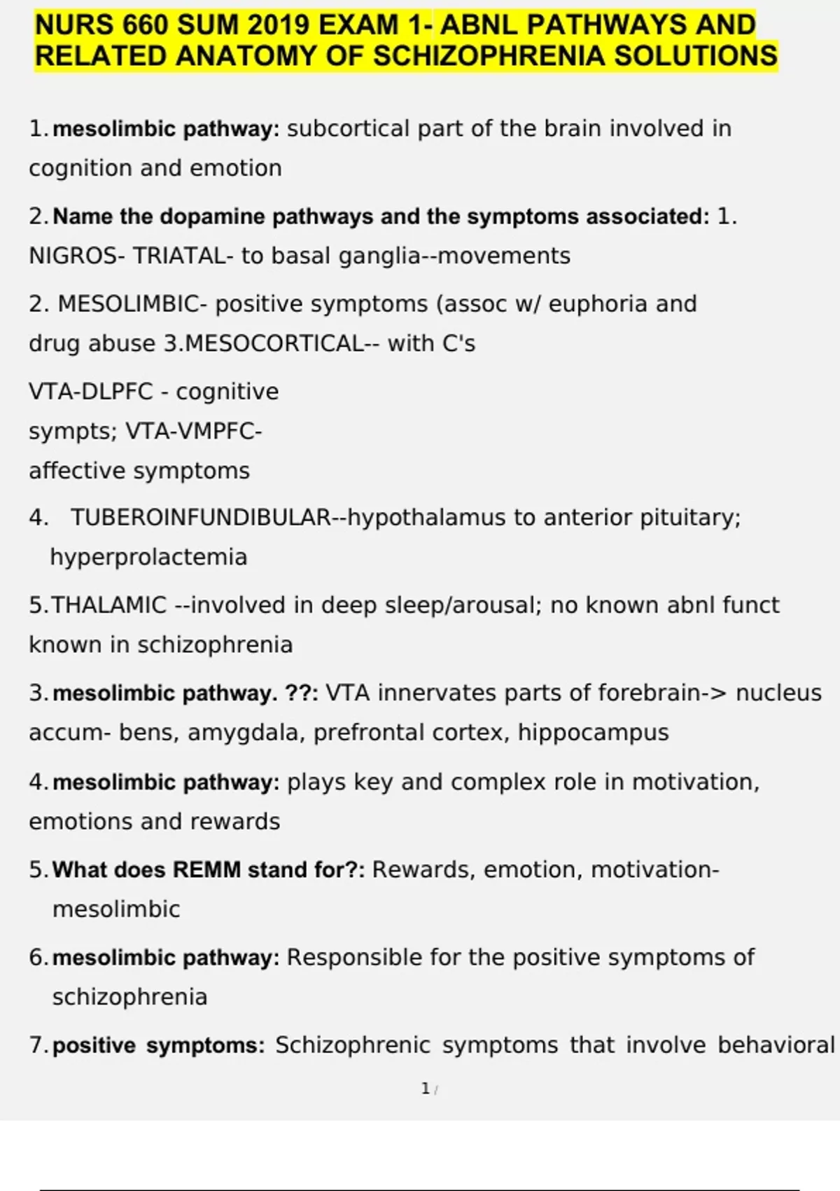 NURS 660 SUM 2019 EXAM 1- ABNL PATHWAYS AND RELATED ANATOMY OF SCHIZOPHRENIA SOLUTIONS QUESTIONS AND ANSWERS A+ GRADED