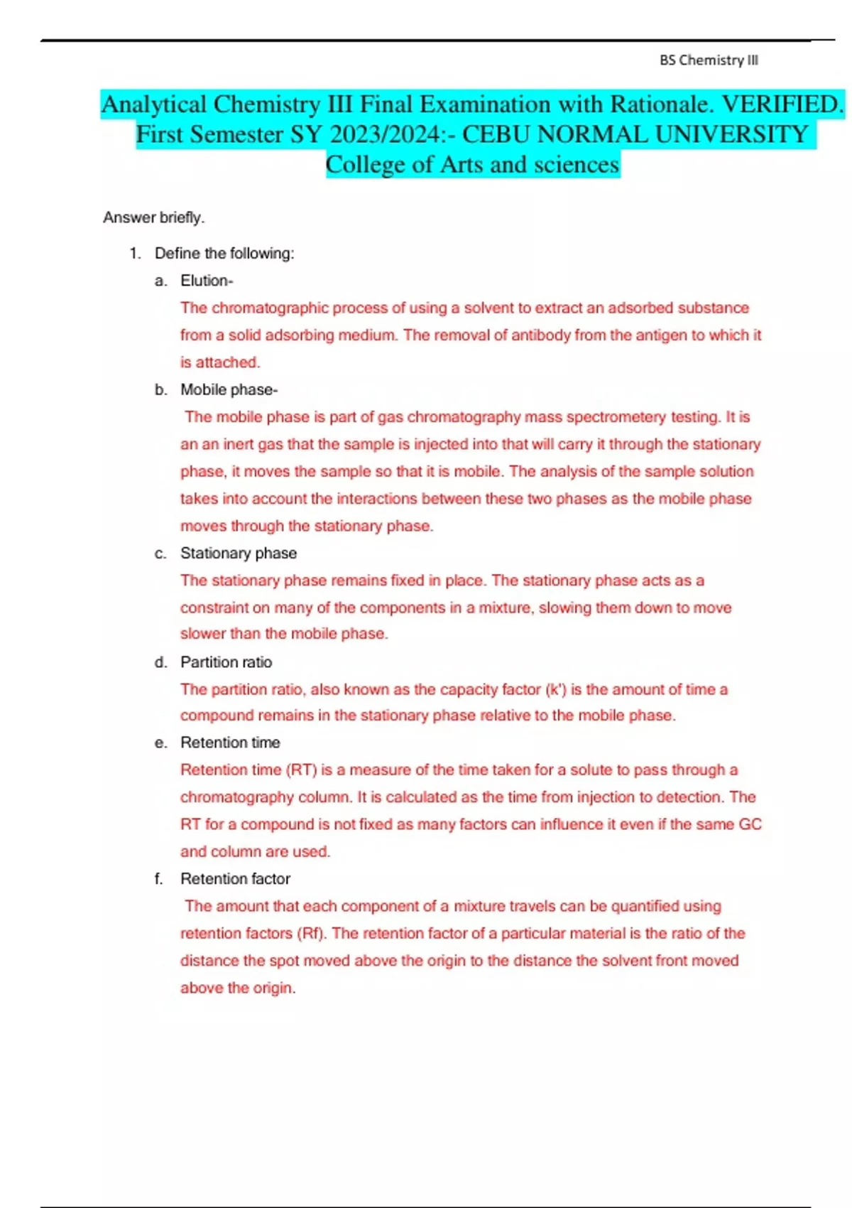 Analytical Chemistry III Final Examination with Rationale. VERIFIED. First Semester SY 2023/2024:- CEBU NORMAL UNIVERSITY College of Arts and sciences Answer briefly. 1. Define the following: a. Elution- The chromatographic process of using a solvent to extract an adsorbed substance from a solid adsorbing medium. The removal of antibody from the antigen to which it is attached. b. Mobile phase- The mobile phase is part of gas chromatography mass spectrometery testing. It is an an inert gas that the sample is injected into that will carry it through the stationary phase, it moves the sample so that it is mobile. The analysis of the sample solution takes into account the interactions between these two phases as the mobile phase moves through the stationary phase. c. Stationary phase The stationary phase remains fixed in place. The stationary phase acts as a constraint on many of the components in a mixture, slowing them down to move slower than the mobile phase. d. Partition ratio The partition ratio, also known as the capacity factor (k') is the amount of time a compound remains in the stationary phase relative to the mobile phase. e. Retention time Retention time (RT) is a measure of the time taken for a solute to pass through a chromatography column. It is calculated as the time from injection to detection. The RT for a compound is not fixed as many factors can influence it even if the same GC and column are used. f. Retention factor The amount that each component of a mixture travels can be quantified using retention factors (Rf). The retention factor of a particular material is the ratio of the distance the spot moved above the origin to the distance the solvent front moved above the origin. 2. What is the difference between gas-liquid and liquid-liquid chromatography? The main difference between gas and liquid chromatography is that the mobile phase of gas chromatography is a gas, which is mos