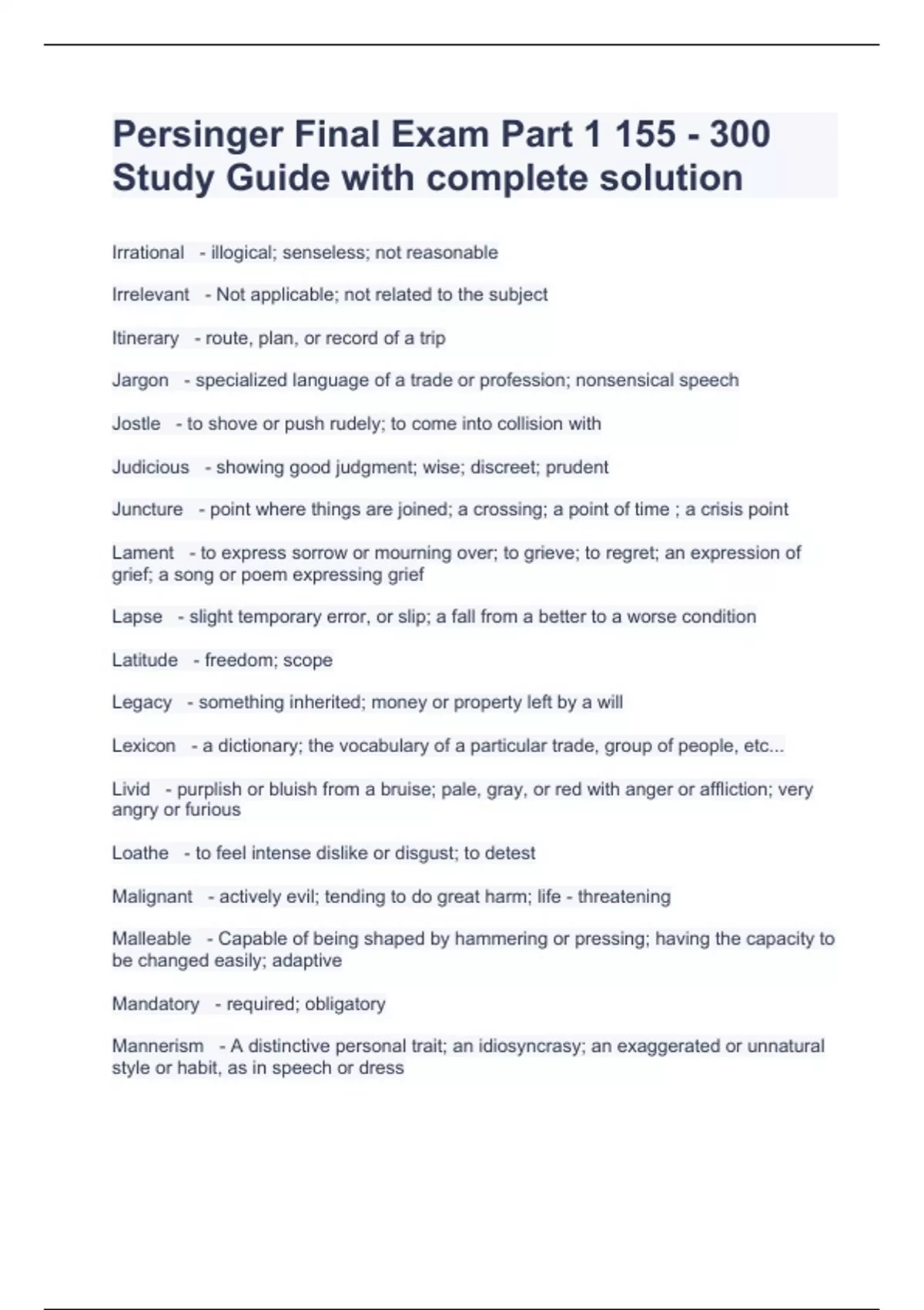 Persinger Final Exam Part 1 155 - 300 Study Guide with complete solution