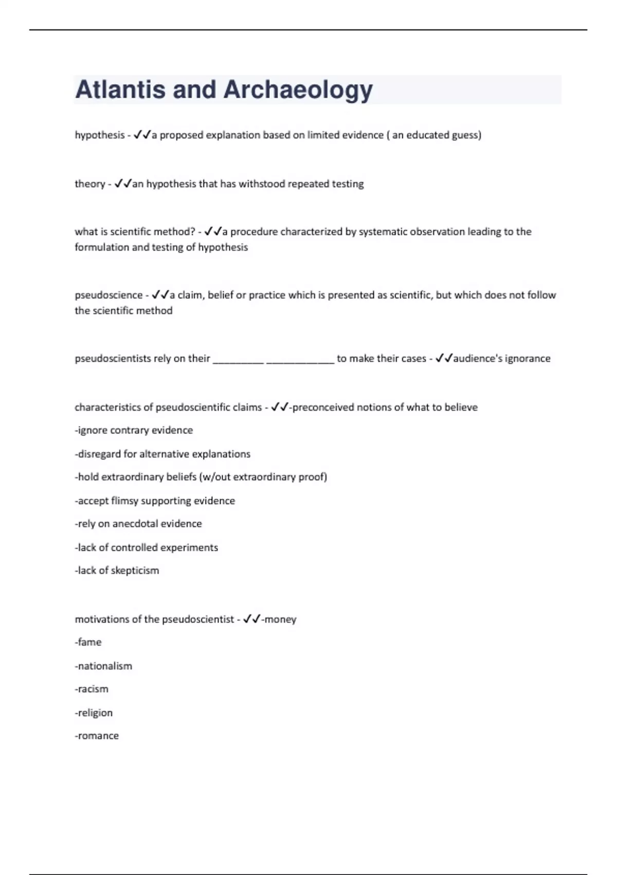 hypothesis - a proposed explanation based on limited evidence ( an educated guess) theory - an hypothesis that has withstood repeated testing what is scientific method? - a procedure characterized by systematic observation leading to the formulation and testing of hypothesis pseudoscience - a claim, belief or practice which is presented as scientific, but which does not follow the scientific method pseudoscientists rely on their _________ ____________ to make their cases - audience's ignorance characteristics of pseudoscientific claims - -preconceived notions of what to believe -ignore contrary evidence -disregard for alternative explanations -hold extraordinary beliefs (w/out extraordinary proof) -accept flimsy supporting evidence -rely on anecdotal evidence -lack of controlled experiments -lack of skepticism motivations of the pseudoscientist - -money -fame -nationalism -racism -religion -romance
