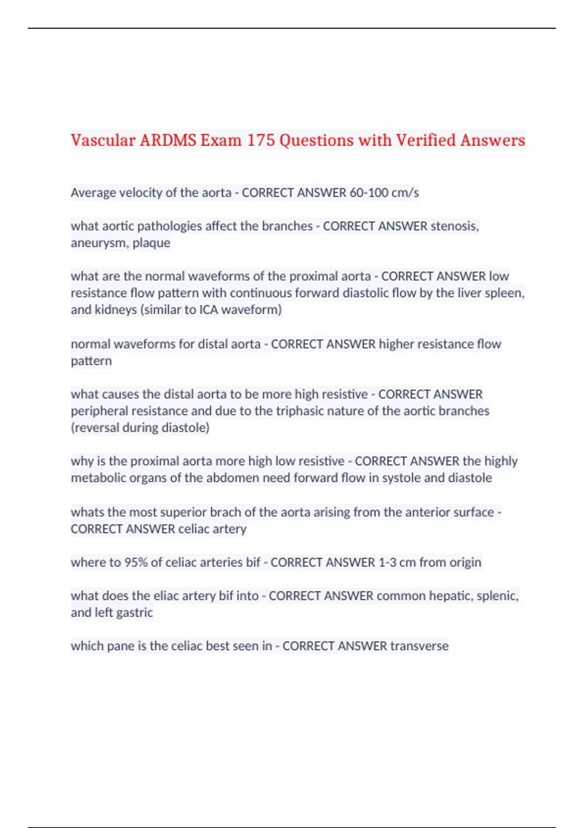 Vascular ARDMS Exam 175 Questions with Verified Answers Average velocity of the aorta - CORRECT ANSWER 60-100 cm/s what aortic pathologies affect the branches - CORRECT ANSWER stenosis, aneurysm, plaque what are the normal waveforms of the proximal aorta - CORRECT ANSWER low resistance flow pattern with continuous forward diastolic flow by the liver spleen, and kidneys (similar to ICA waveform) normal waveforms for distal aorta - CORRECT ANSWER higher resistance flow pattern what causes the distal aorta to be more high resistive - CORRECT ANSWER peripheral resistance and due to the triphasic nature of the aortic branches (reversal during diastole) why is the proximal aorta more high low resistive - CORRECT ANSWER the highly metabolic organs of the abdomen need forward flow in systole and diastole whats the most superior brach of the aorta arising from the anterior surface - CORRECT ANSWER celiac artery where to 95% of celiac arteries bif - CORRECT ANSWER 1-3 cm from origin what does the eliac artery bif into - CORRECT ANSWER common hepatic, splenic, and left gastric which pane is the celiac best seen in - CORRECT ANSWER transverse what is the normal waveform for the celiac - CORRECT ANSWER low resistance flow due to the vascular beds of the liver and spleen with continuous forward flow during diastole what happens if the celiac occludes - CORRECT ANSWER collateralization throught the pancreaticoduodenal arterial arcade-network of small vessels surrounding the pancreas and duodenum (feed into duodenum then into the common hepatic) how does the splenic artery run - CORRECT ANSWER it follows a tortuous course long the posterior, superior pancreatic body and tail with several pancreatic and gastric branches where does the splenic artery originate - CORRECT ANSWER it is a branch off of the celiac axis where does the splenic artery terminate - CORRECT ANSWER ends as branches in the splenic hilum what is the normal splenic artery waveform - CORRECT ANSWER turbulent flow due to tortuosity (fig 26-3, 441) what is the best way to evaluate the spenic artery - CORRECT ANSWER in the transverse plane from the anterior midline along the tail, eval distal from left lateral window at splenic hilum wheredoes the common hepatic artery lay - CORRECT ANSWER in the superior border of the pancreatic head, its the right branch of the celiac what does the common hepatic give rise to - CORRECT ANSWER the GDA where does the common hepatic artery turn into the proper hepatic artery - CORRECT ANSWER past the GDA what occurs after the proper hepatic artery enters the liver - CORRECT ANSWER it divides into right and left branches what is the normal wave form for the common hepatic artery - CORRECT ANSWER low resistance continuous forward diastolic flow where is the best place to evaluate the common hepatic artery - CORRECT ANSWER eval from anterior abdominal window at the porta hepatis where does the sma arise? - CORRECT ANSWER anterior aorta distal to celiac trunk what is the course of the SMA - CORRECT ANSWER it has a short anterior segment then turns inferiorly and ends near the ileoceccal valve what is the normal waveform of the SMA and IMA in a fasting patient - CORRECT ANSWER high resistance flow with sharp systolic peaks and absent late diastolic flow What is the normal waveform of the SMA and IMA 30-90 minutes post prandial - CORRECT ANSWER low resistance pattern with broad systolic peaks and continuous diastolic flow whats the best way to eval the SMA and IMA - CORRECT ANSWER eval in transverse from anterior what does the sma supply - CORRECT ANSWER branches supply the jejunum, ileum cecum, ascending colon, proximal 2/3rds of the transverse colon, portions of the duodenum, and the pancreatic head where does the sma lie in relation to the smv and the left renal vein - CORRECT ANSWER to the right of the smv and the left renal vein courses between the sma and aorta what is the function of the portal venous system - CORRECT ANSWER it transports nutrient rich blood from the intestines and spleen to the liver what is the normal flow of the PV system - CORRECT ANSWER hepatopedal (unidirectional forward flow) with subtle phasic variation produced by respiratory and cardiac hemodynamic effects and unidirectional; sounds like a windstorm what does the normal portal vein measure - CORRECT ANSWER no larger than 13 mm in diameter but increases with sustained deep inspiration (splenic and SMV can increase 50-100 percent in size with this). this response negates portal HTN what occurs in the portal system in a patient with CHF - CORRECT ANSWER the main portal vein may demonstrate a doppler waveform that is bidirectional with pulsatile flow what is the origin of the portal vein - CORRECT ANSWER begins at junction of splenic and SMV immediately posterior to pancreas neck and courses superior to the right and passes posterior to the first portion of the duodenum and terminates at the porta hepatis what joins to form the MPV - CORRECT ANSWER the SMV runs superior from the intestines to join the SV and form the MPV what is the largest tributary to the IVC - CORRECT ANSWER the hepatic veins what is the normal flow of the hepatic veins - CORRECT ANSWER hepatofugal flow that is chaotic pulsatile flow pattern from transmission of RA pulsatations what effect does CHF have on the hepatic veins - CORRECT ANSWER they become enlarged Which lobe do the hepatic veins not drain - CORRECT ANSWER the caudate lobe where does the right hepatic vein run - CORRECT ANSWER coronal betwen the anterior and posterior segments of the right lobe where does the middle hep v run - CORRECT ANSWER between the right and left lobes where does the left hep v run - CORRECT ANSWER between the medial and lateral segments of the left lobe where is the IVC located - CORRECT ANSWER anterior to the spine and to the right of the aorta what is the normal size for the IVC - CORRECT ANSWER seldom exceeds 2.5 cm but varies with respiration and cardiac cycle (inspirations 