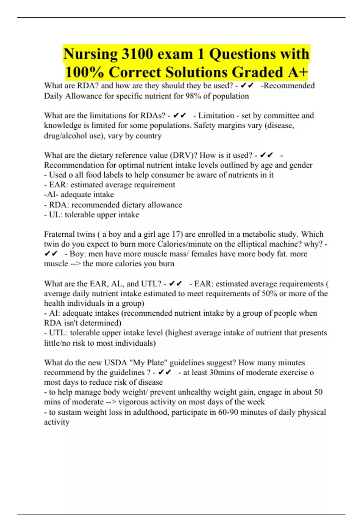 nursing 3100 exam 1 questions with 100 correct so