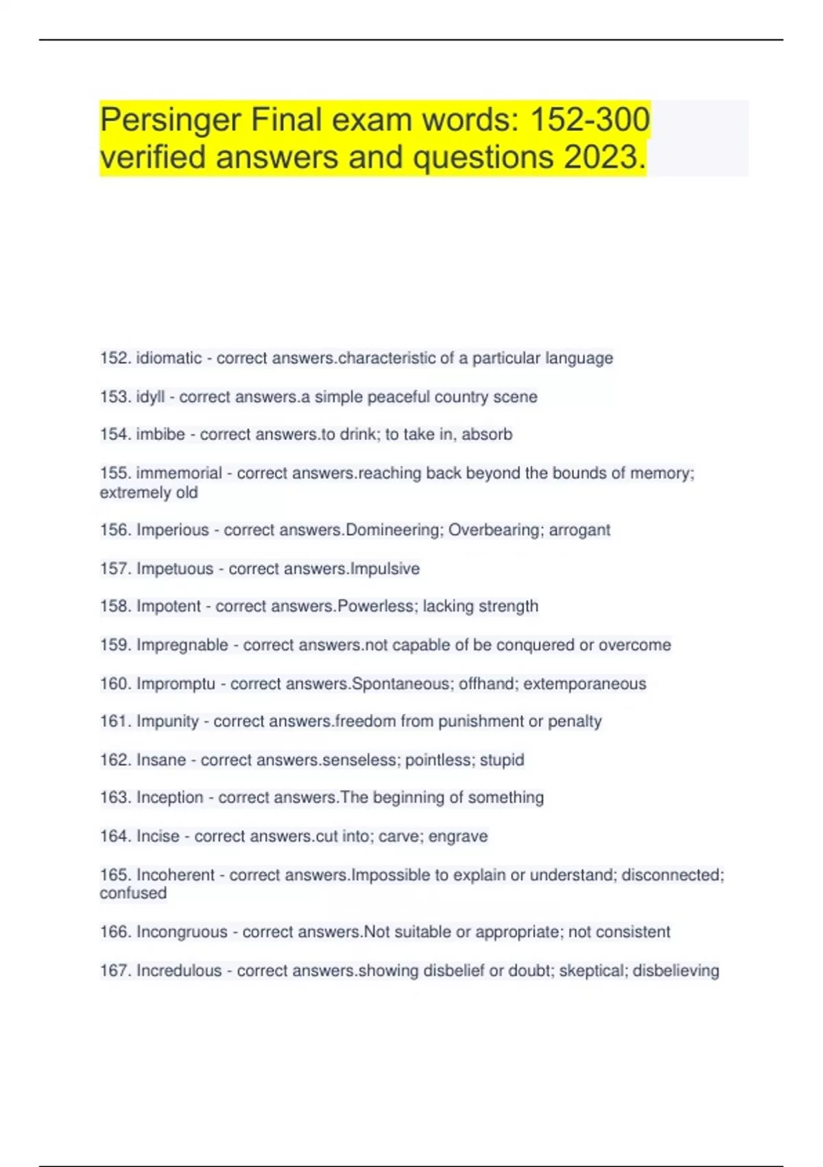 Persinger Final exam words: 152-300 verified answers and questions 2023. 152. idiomatic - correct cteristic of a particular language 153. idyll - correct answers.a simple peaceful country scene 154. imbibe - correct drink; to take in, absorb 155. immemorial - correct ing back beyond the bounds of memory; extremely old 156. Imperious - correct answers.Domineering; Overbearing; arrogant 157. Impetuous - correct answers.Impulsive 158. Impotent - correct answers.Powerless; lacking strength 159. Impregnable - correct capable of be conquered or overcome 160. Impromptu - correct answers.Spontaneous; offhand; extemporaneous 161. Impunity - correct om from punishment or penalty 162. Insane - correct less; pointless; stupid 163. Inception - correct answers.The beginning of something 164. Incise - correct into; carve; engrave 165. Incoherent - correct answers.Impossible to explain or understand; disconnected; confused 166. Incongruous - correct answers.Not suitable or appropriate; not consistent 167. Incredulous - correct ng disbelief or doubt; skeptical; disbelieving 168. Indigenous - correct e to a certain area 169. Indolence - correct ess; tendency to avoid work 170. Inexplicable - correct answers.Impossible to explain or understand; not consistent; out of place 171. infer - correct conclude from evidence 172. ingratiate - correct bring oneself into someone's good graces or favor. 173. inherent - correct ing as a part of the essential character of something. 174. innocuous - correct ess; having no injurious or adverse effects; lacking impact. 175. insatiable - correct able of being satisfied; greedy; unquenchable. 176. insidious - correct ; treacherous; working in a hidden but generous way. 177. insular - correct g to do with islands or life on an island; isolated; narrow-minded. 178. intangible - correct capable of being touched; not material; vague. 179. interminable - correct ss; occurring over and over again indefinitely. 180. interpose - correct put between; to insert between parts; to interject during a conversation; to intervene. 181. intrepid - correct or resolute; showing great courage. 182. intricacy - correct condition or quality of being complex, complicated, or involved; elaborateness. 183. intrinsic - correct ging to a thing by its essential nature; inherent. 184. introspective - correct to the examination of one's own thoughts and feelings; contemplative. 185. inure - correct accustom or habituate, usually to something undesirable.