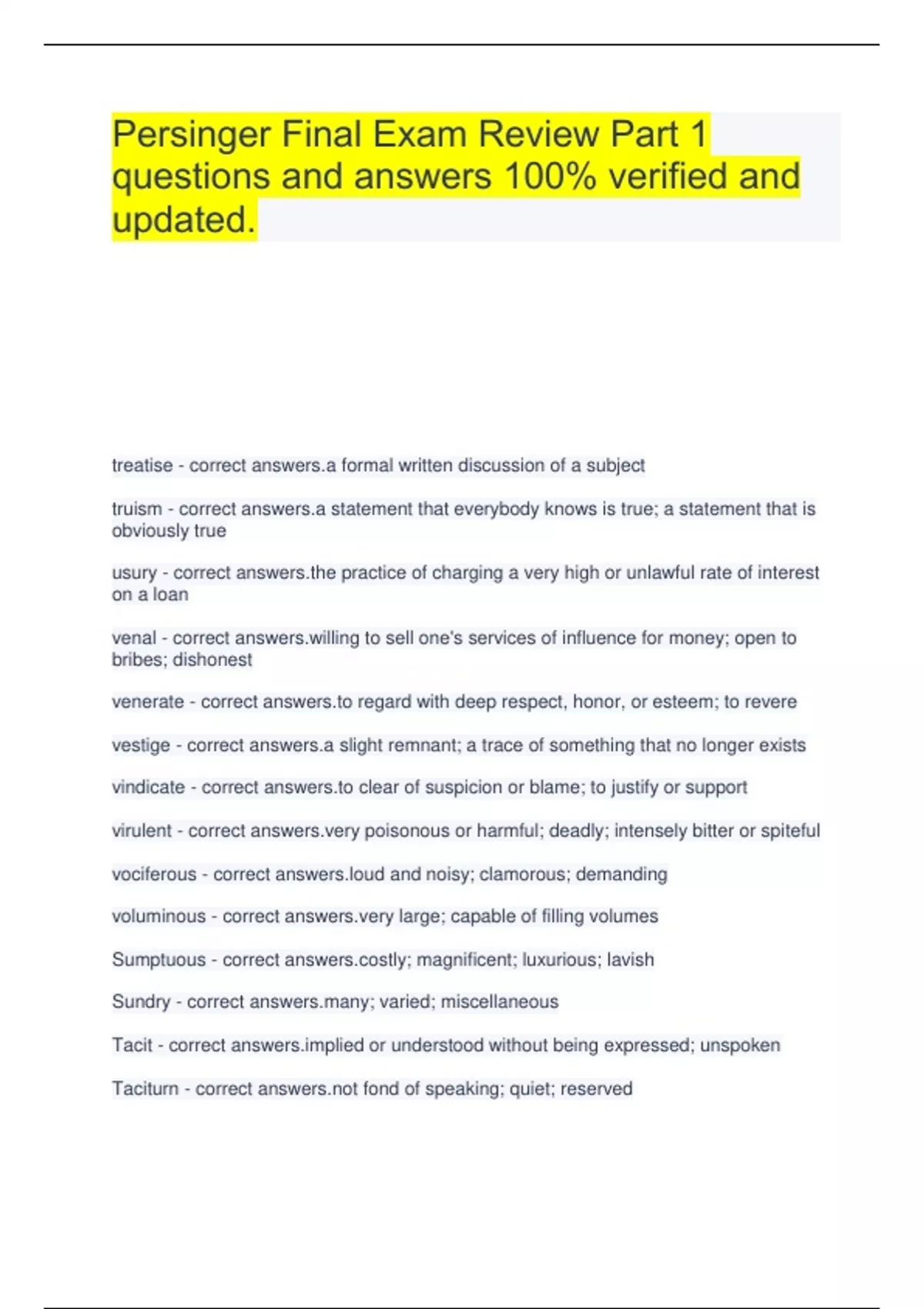 Persinger Final Exam Review Part 1 questions and answers 100% verified and updated. treatise - correct answers.a formal written discussion of a subject truism - correct answers.a statement that everybody knows is true; a statement that is obviously true usury - correct practice of charging a very high or unlawful rate of interest on a loan venal - correct ng to sell one's services of influence for money; open to bribes; dishonest venerate - correct regard with deep respect, honor, or esteem; to revere vestige - correct answers.a slight remnant; a trace of something that no longer exists vindicate - correct clear of suspicion or blame; to justify or support virulent - correct poisonous or harmful; deadly; intensely bitter or spiteful vociferous - correct and noisy; clamorous; demanding voluminous - correct large; capable of filling volumes Sumptuous - correct y; magnificent; luxurious; lavish Sundry - correct ; varied; miscellaneous Tacit - correct ed or understood without being expressed; unspoken Taciturn - correct fond of speaking; quiet; reserved Temerity - correct ess boldness; rashness; foolhardiness Tenable - correct le of being held or defended; logical; defensible Tenuous - correct ; not substantial; flimsy Tenure - correct holding of an office; the length of time for which a position is held; the permanence of position granted to a teacher Terra firma - correct earth; firm ground Testimonial - correct answers.a recommendation of a person or product; a tribute to a person's accomplishments Scrupulous - correct g strict attention to what is right or proper; exact and careful Scurrilous - correct to the use of abusive or indecent language; foulmouthed Sedentary - correct to sitting much of the time; moving little and rarely Seraphic - correct ic Solicitous - correct ng concern or worry; anxiously concerned; eager Sonorous - correct g out or having a deep, rich sound Specious - correct ngly desirable, reasonable, or true but not really so; having a deceptively good appearance Strident - correct g or making a harsh wound; shrill Subjugate - correct subdue; to conquer to worry; anxiously concerned; eager Subversion - correct overthrowing or undermining of something established, especially a government Restitution - correct return of what has been lost or taken away; compensation for any loss or damage Retaliate - correct return an injury for an injury; to get even Retroactive - correct ing to or having an effect on events that are past